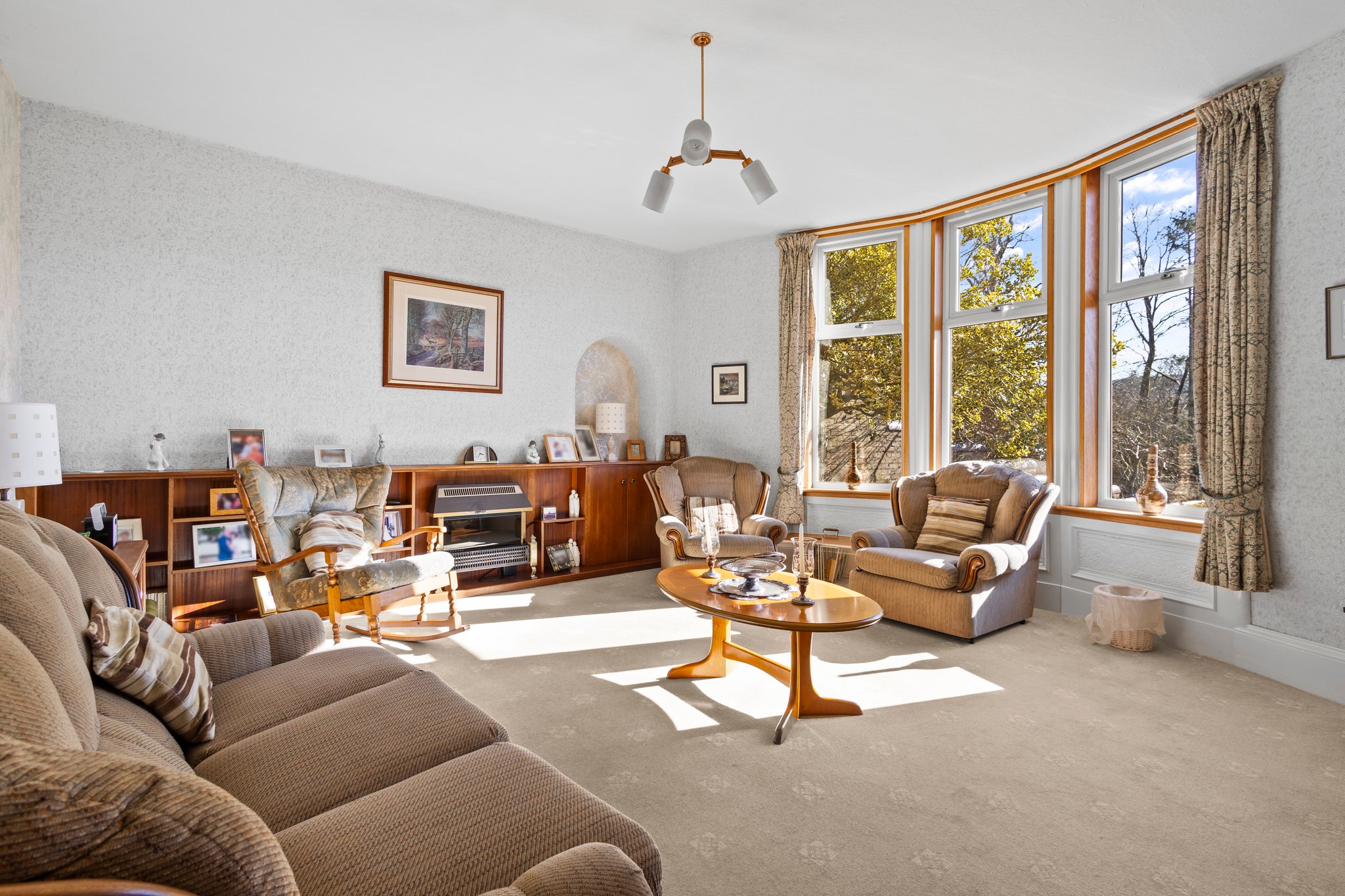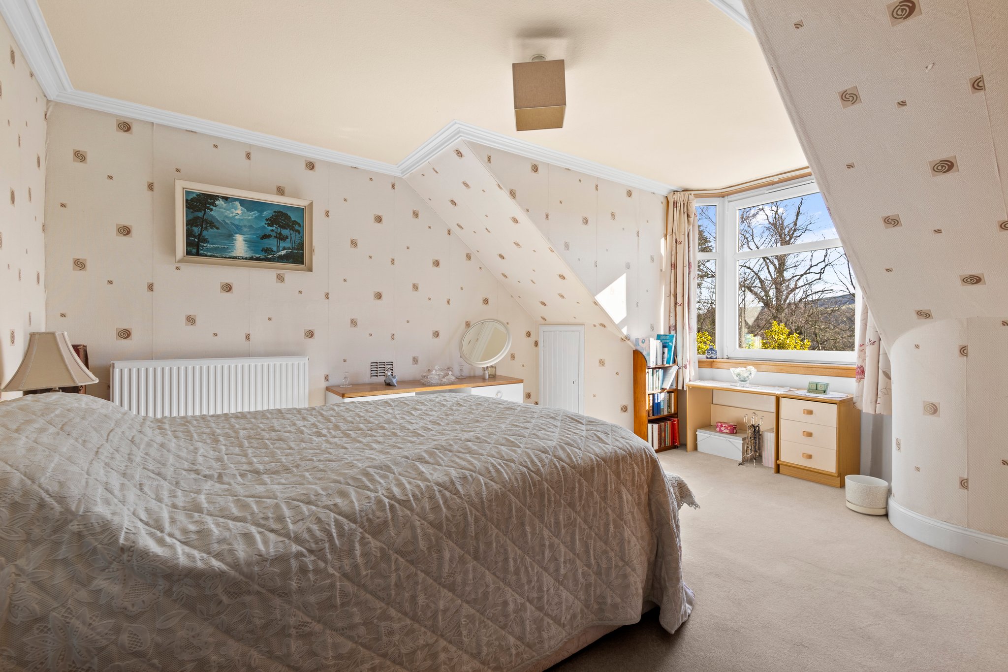 5.19m x 4.16m (17′ 0″ x 13′ 8″) Generously proportioned main apartment offering neutral decor, feature fireplace, traditional high ceilings and deep skirtings, plentiful space for free standing furniture, fitted carpet and a large traditional bay window to the rear.