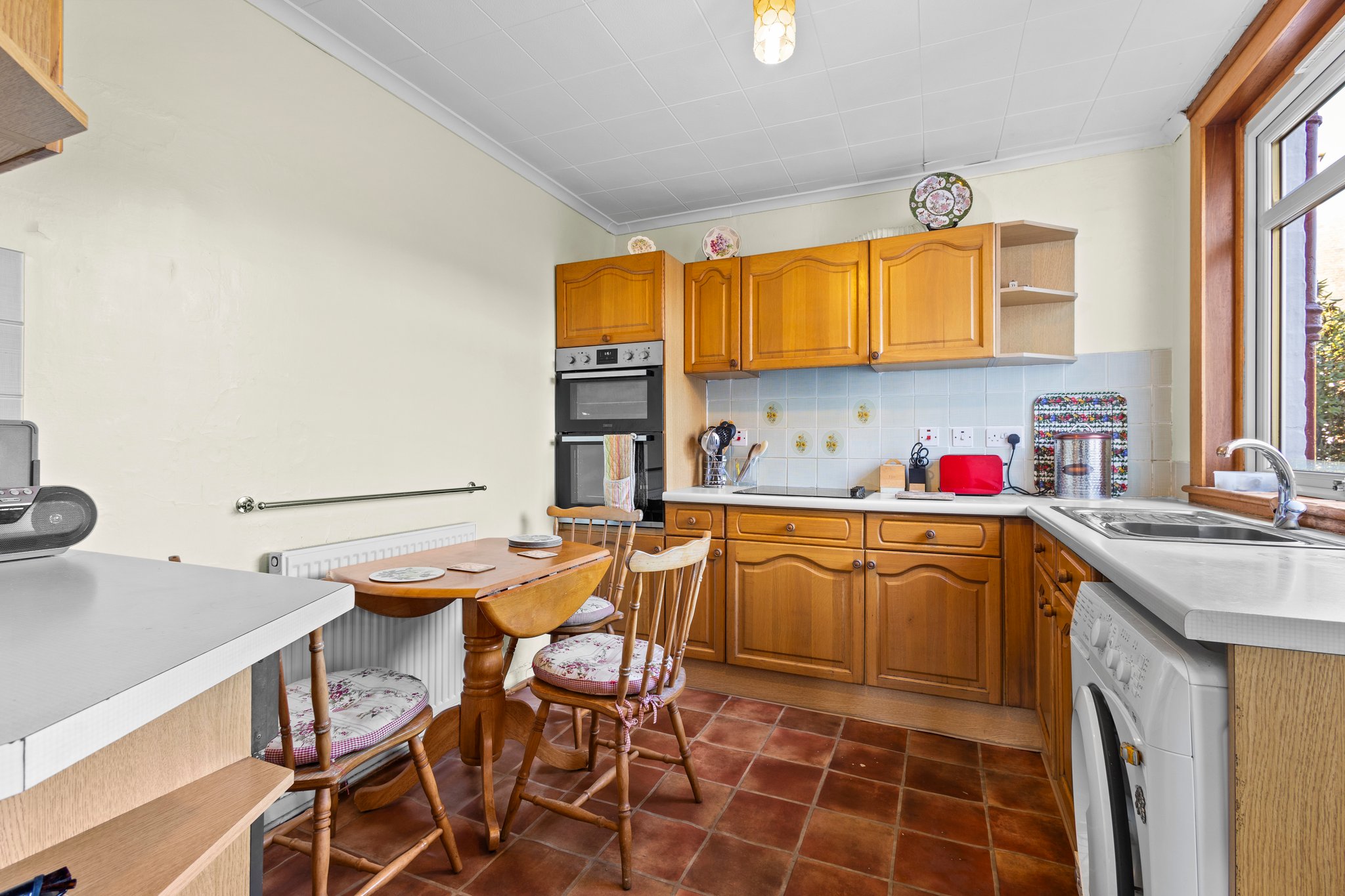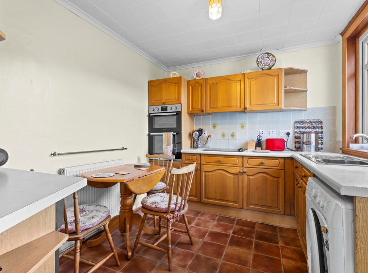 2.81m x 3.24m (9′ 3″ x 10′ 8″) Fully fitted kitchen complete with ample wall and base storage units, integrated oven, electric hob, plumbing and space for a washing machine, stainless steel sink and drainer, neutral decor, vinyl flooring, a double glazed window to the side and a door to the front.