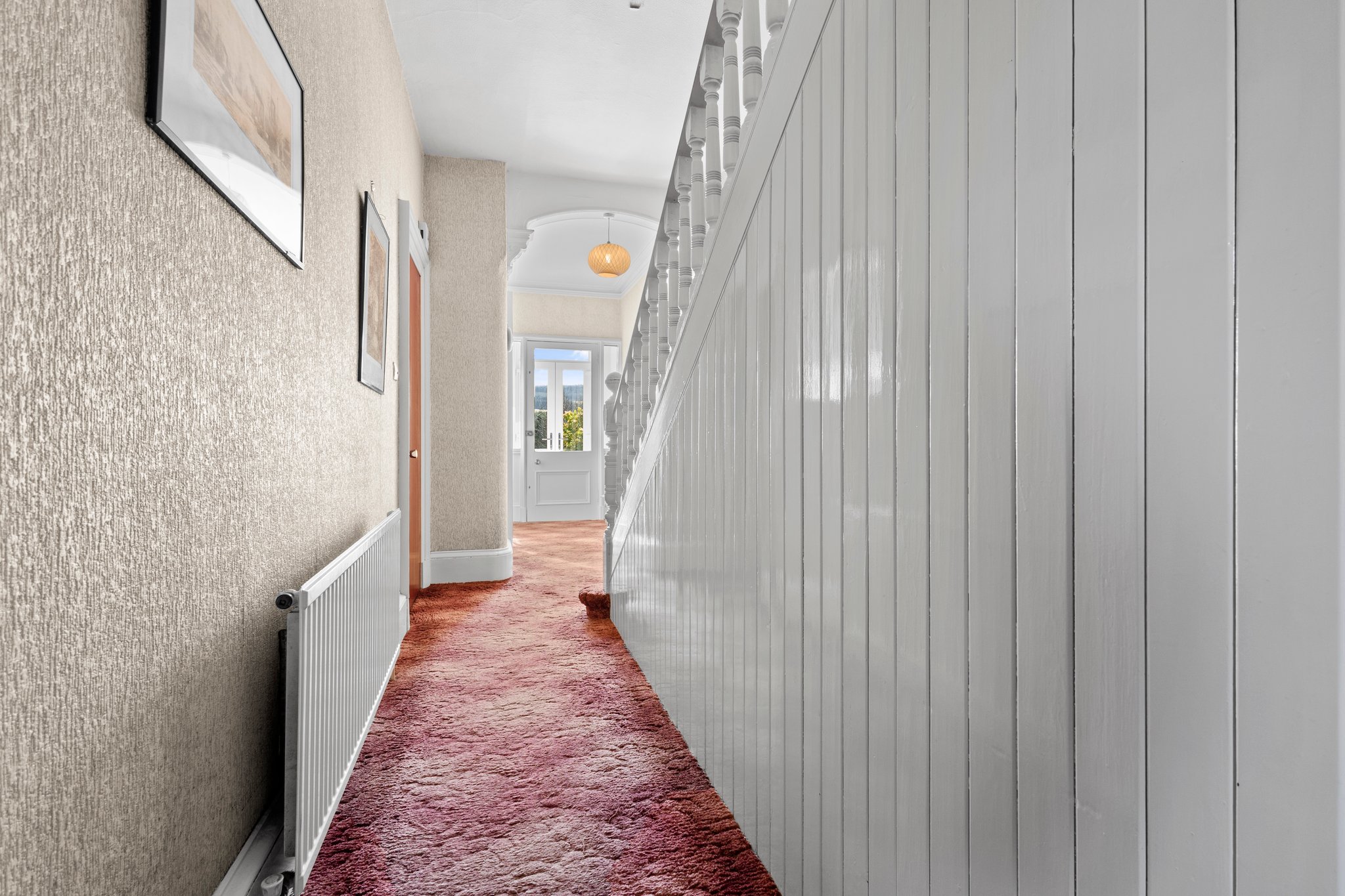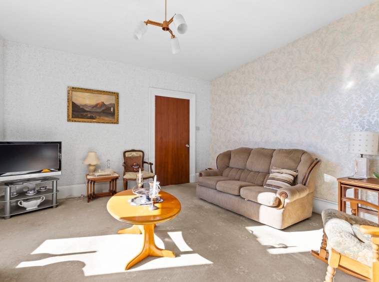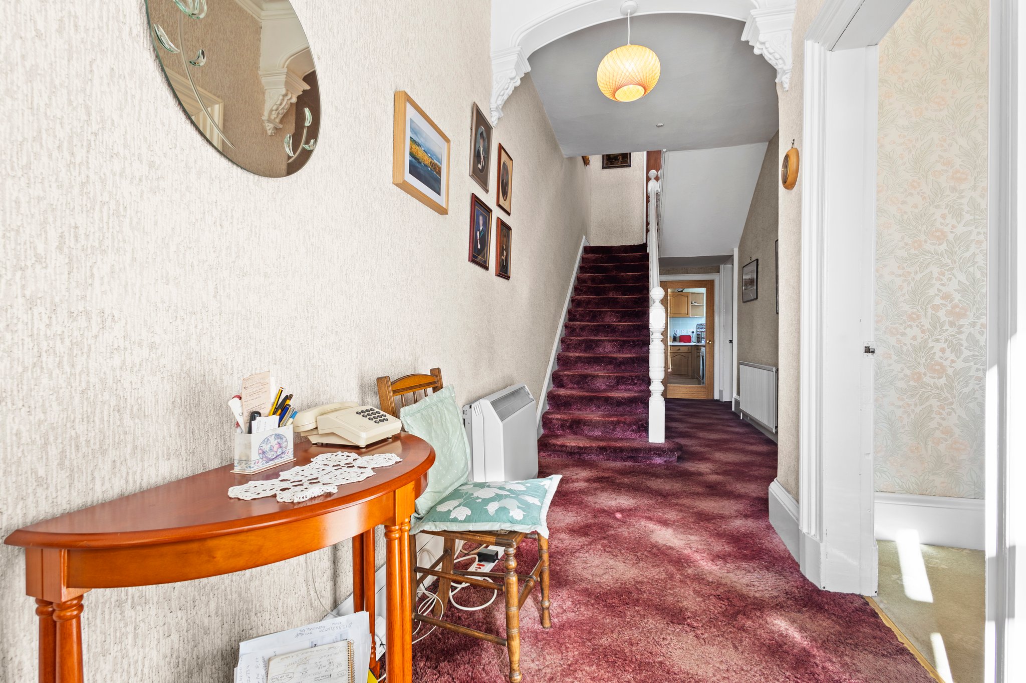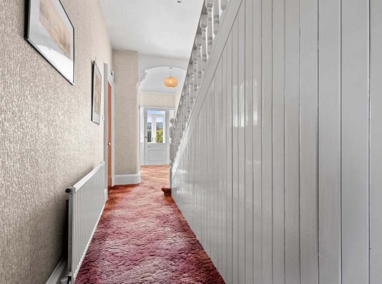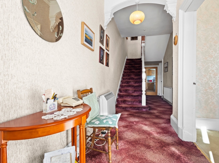 1.67m x 3.50m (5′ 6″ x 11′ 6″) Spacious hallway boasting neutral decor, two practical storage cupboards, traditional high ceiling and ceiling cornicing, deep skirtings and a fitted carpet. The hallway gives access to the lounge, family/dining room, kitchen and a carpeted staircase leads to the upper level.