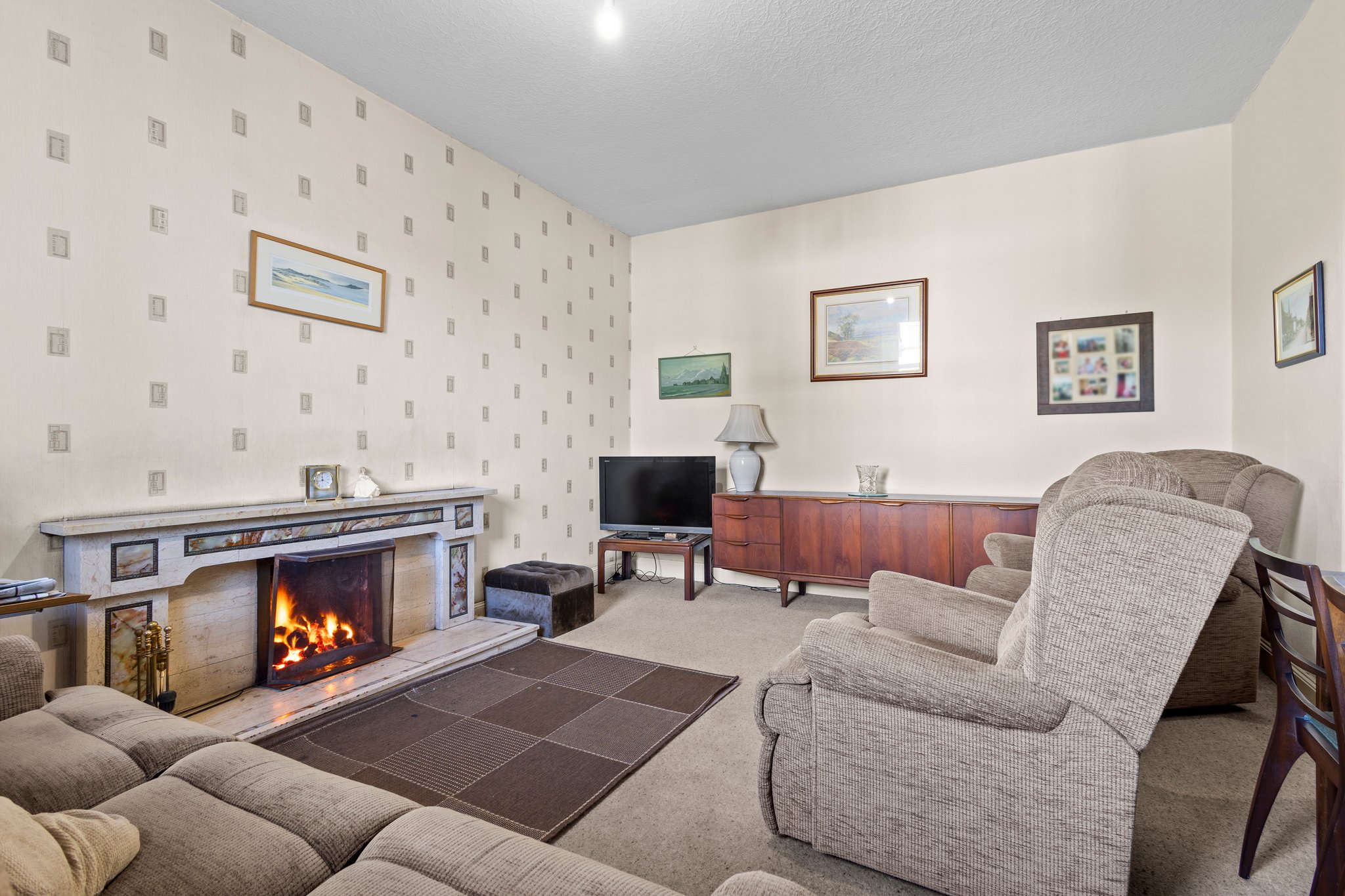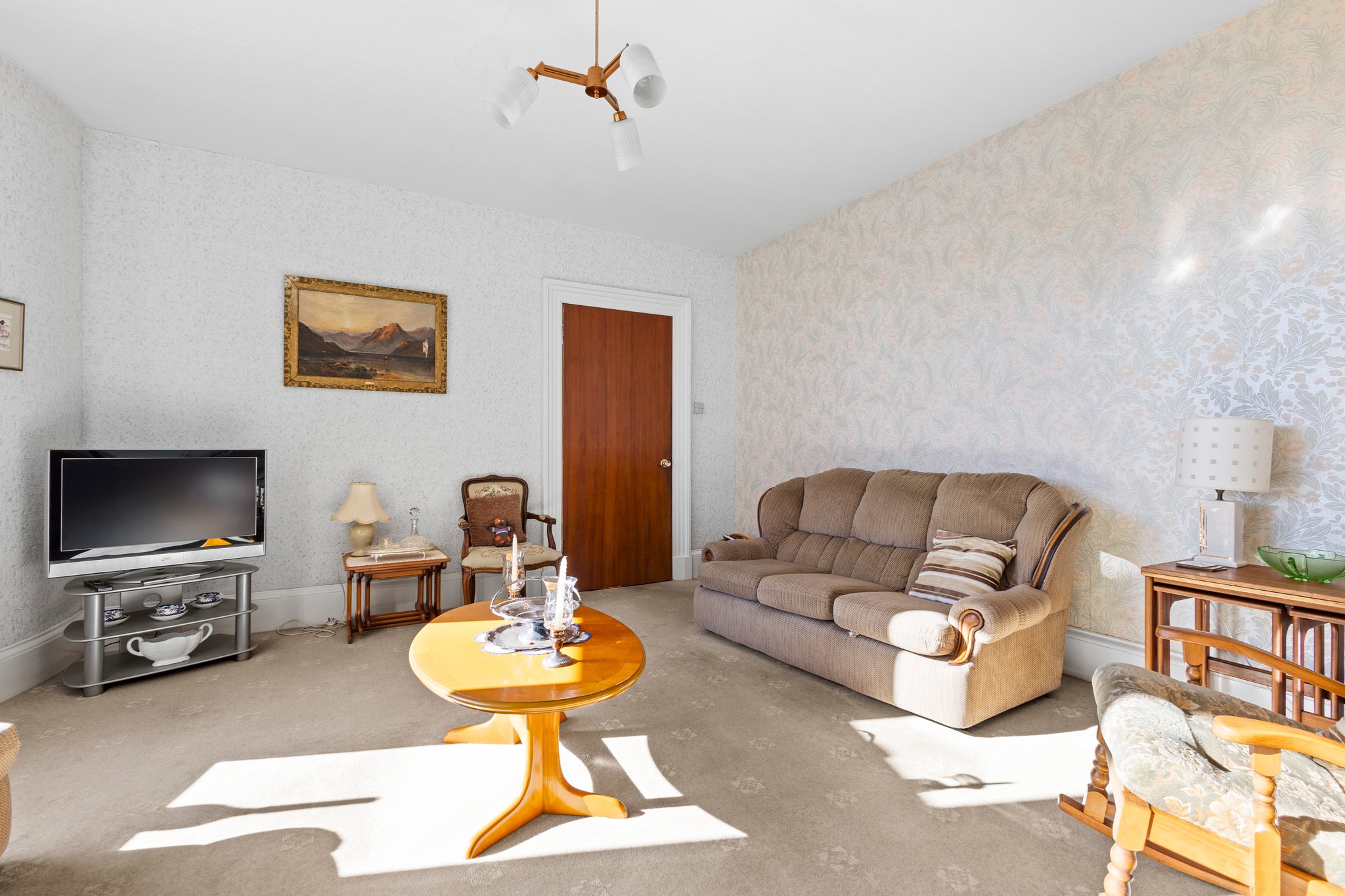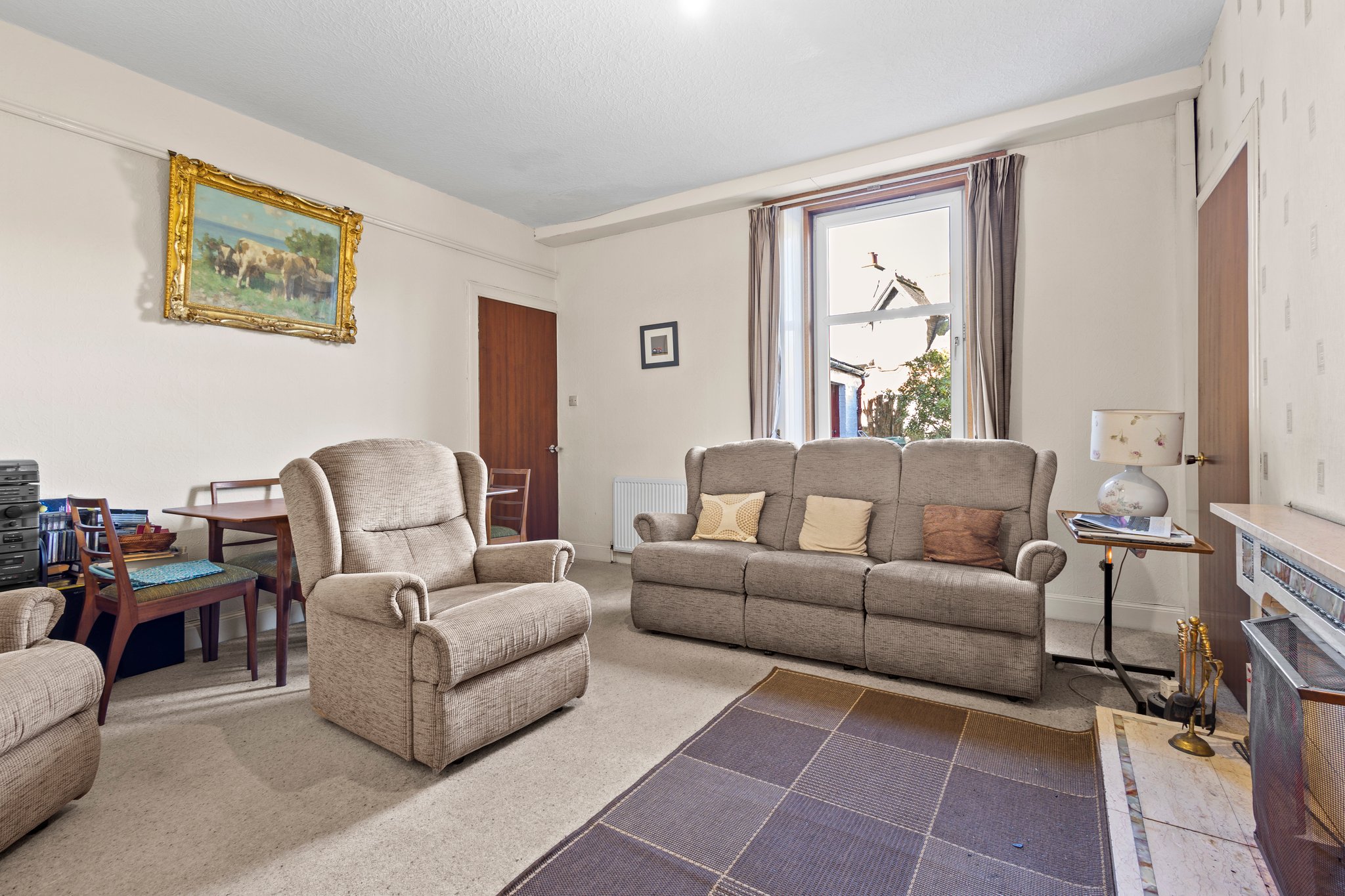 1.67m x 3.50m (5′ 6″ x 11′ 6″) Spacious hallway boasting neutral decor, two practical storage cupboards, traditional high ceiling and ceiling cornicing, deep skirtings and a fitted carpet. The hallway gives access to the lounge, family/dining room, kitchen and a carpeted staircase leads to the upper level.