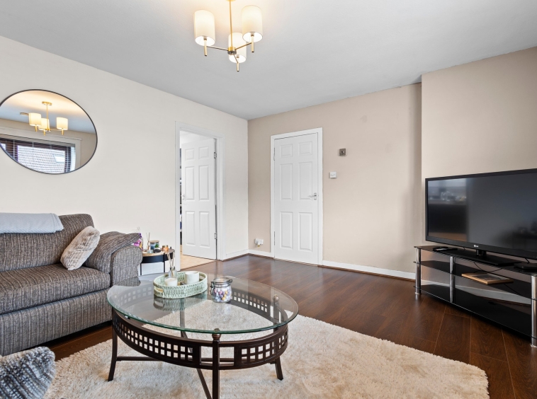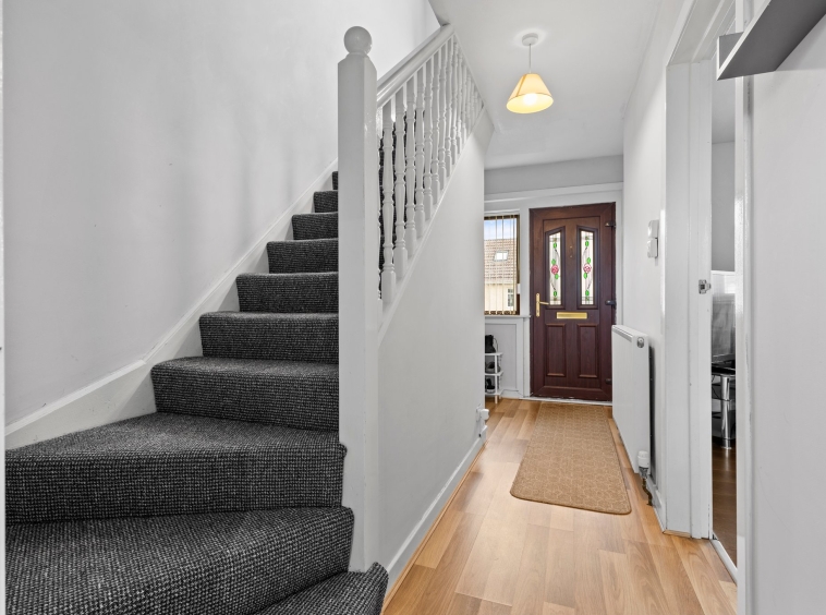 2.24m x 4.40m (7′ 4″ x 14′ 5″) With access via the outer UPVC double glazed door, the welcoming entrance hallway offers neutral wall finishes and laminate flooring, practical under stairs storage cupboard, door access to lounge and bathroom, carpeted staircase to the upper level.