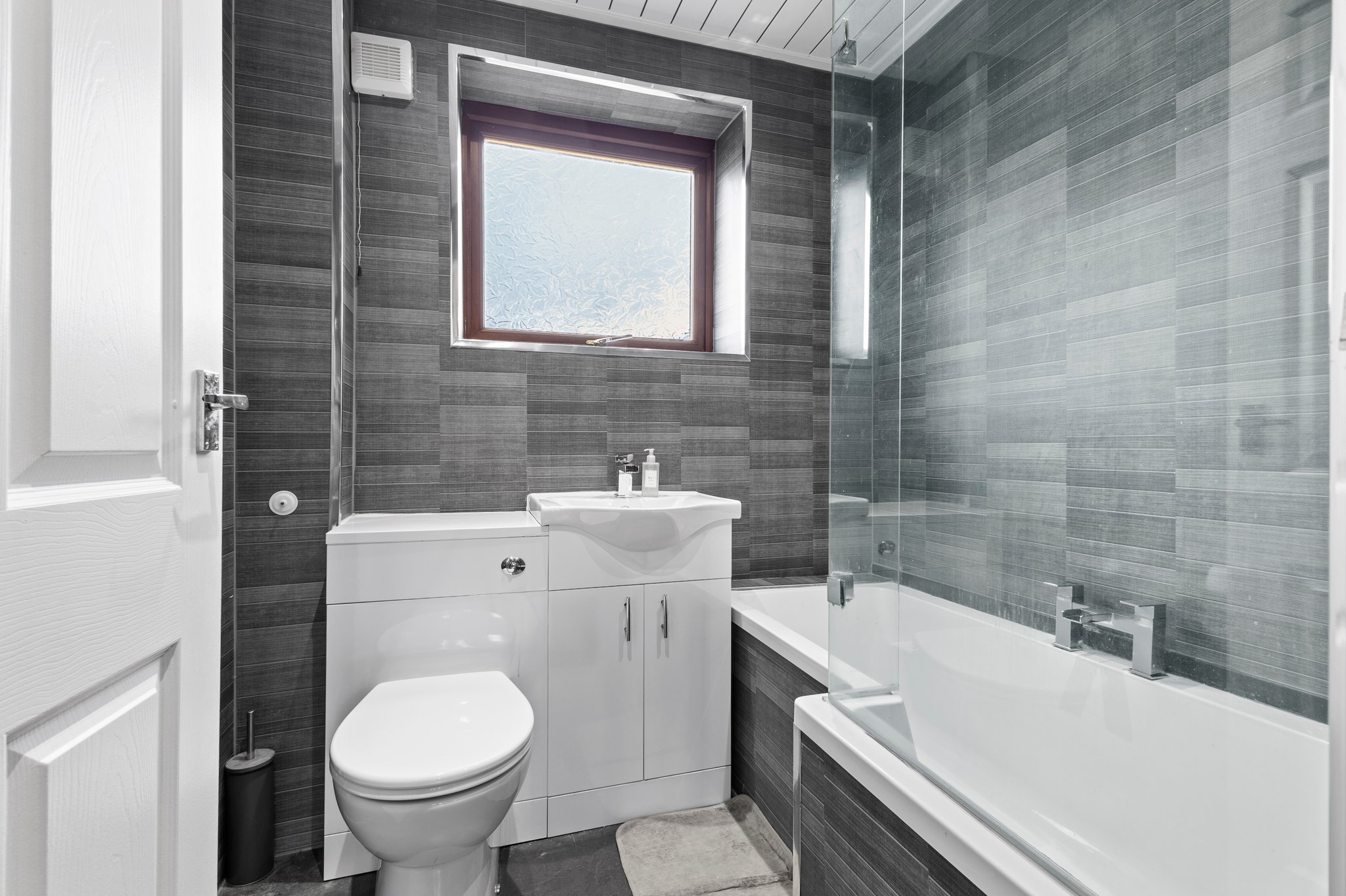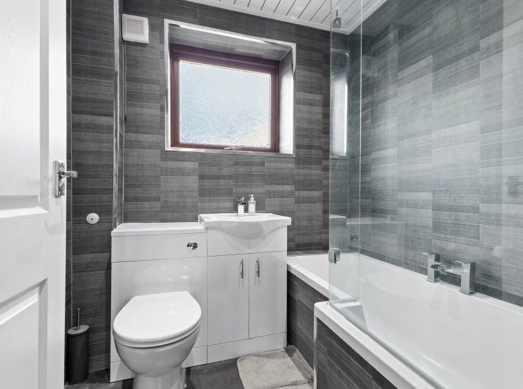 2.03m x 1.77m (6′ 8″ x 5′ 10″) Contemporary three piece white suite comprising of bath with mixer taps and over bath mains operated shower, WC and wash hand basin combination vanity unit, contemporary tile effect wet wall around walls, vinyl flooring, ceiling spot lights and a double glazed window to the rear.