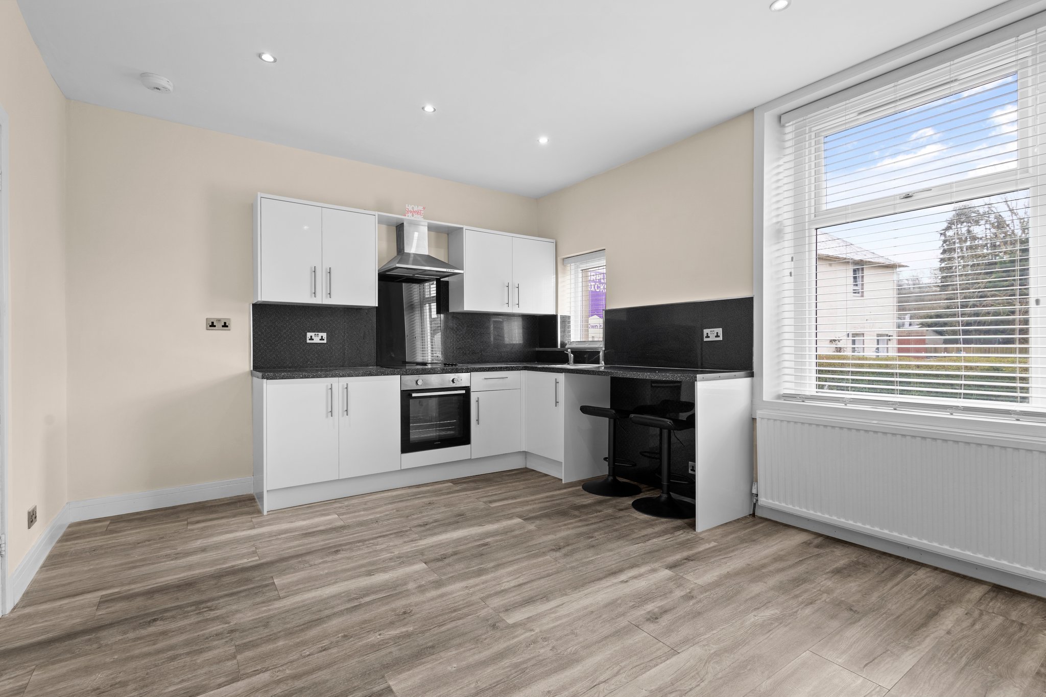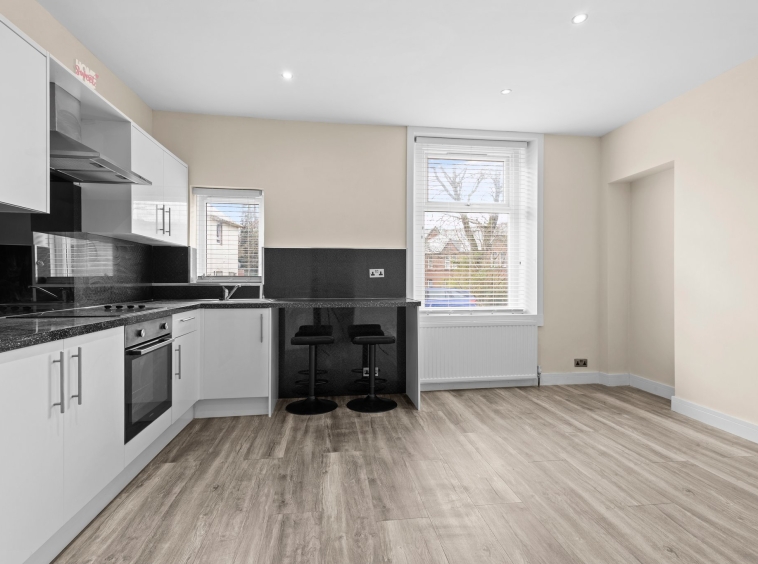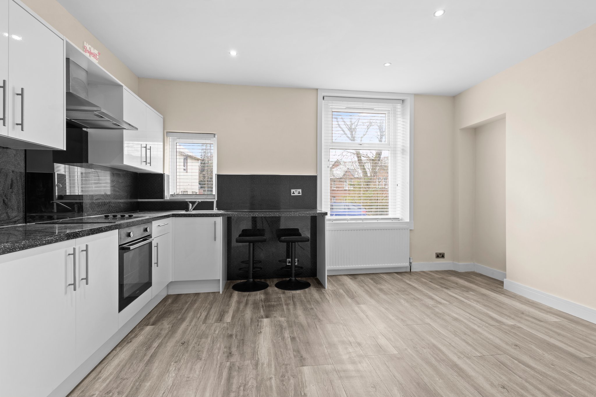 2.36m x 3.69m (7′ 9″ x 12′ 1″) 2.40m x 3.69m (7′ 10″ x 12′ 1″) Impressive open plan main apartment offering modern neutral decor, plentiful space for free standing furniture, laminate flooring and two double glazed windows to the front. The kitchen area is complete with contemporary wall and base units providing ample storage with a stylish contrasting work surface, integrated oven, electric hob and hood, stainless steel, practical breakfast bar seating area, neutral decor and a stylish splashback.