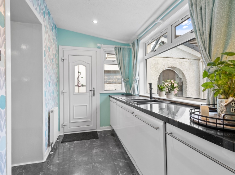 3.47m x 1.96m (11′ 5″ x 6′ 5″) Practical, separate utility room providing additional storage units and work surfaces, integrated dishwasher, washing machine and freezer, tasteful decor, double glazed window to the rear and door leading out to driveway. Door to kitchen and open arch to lounge.