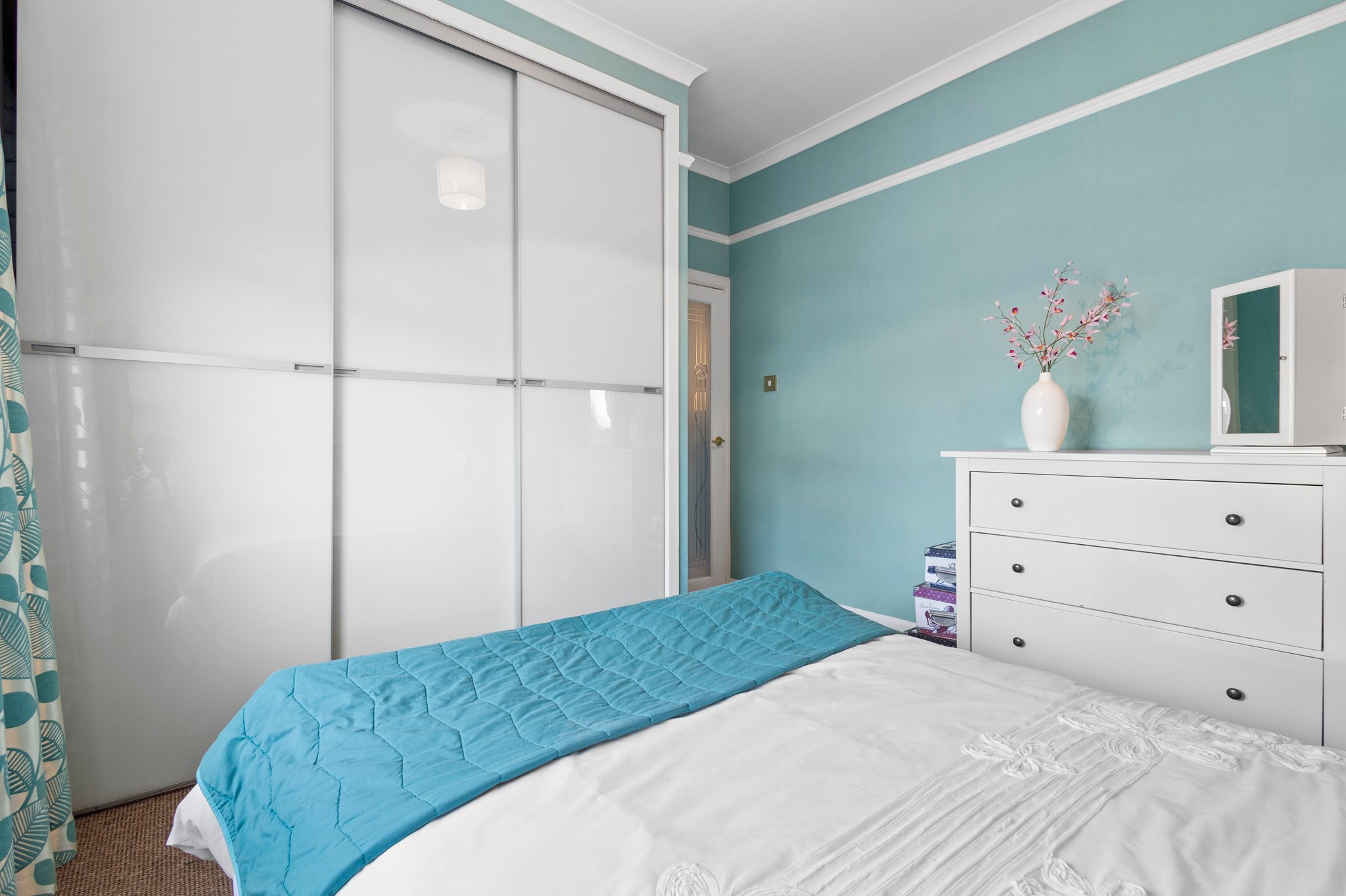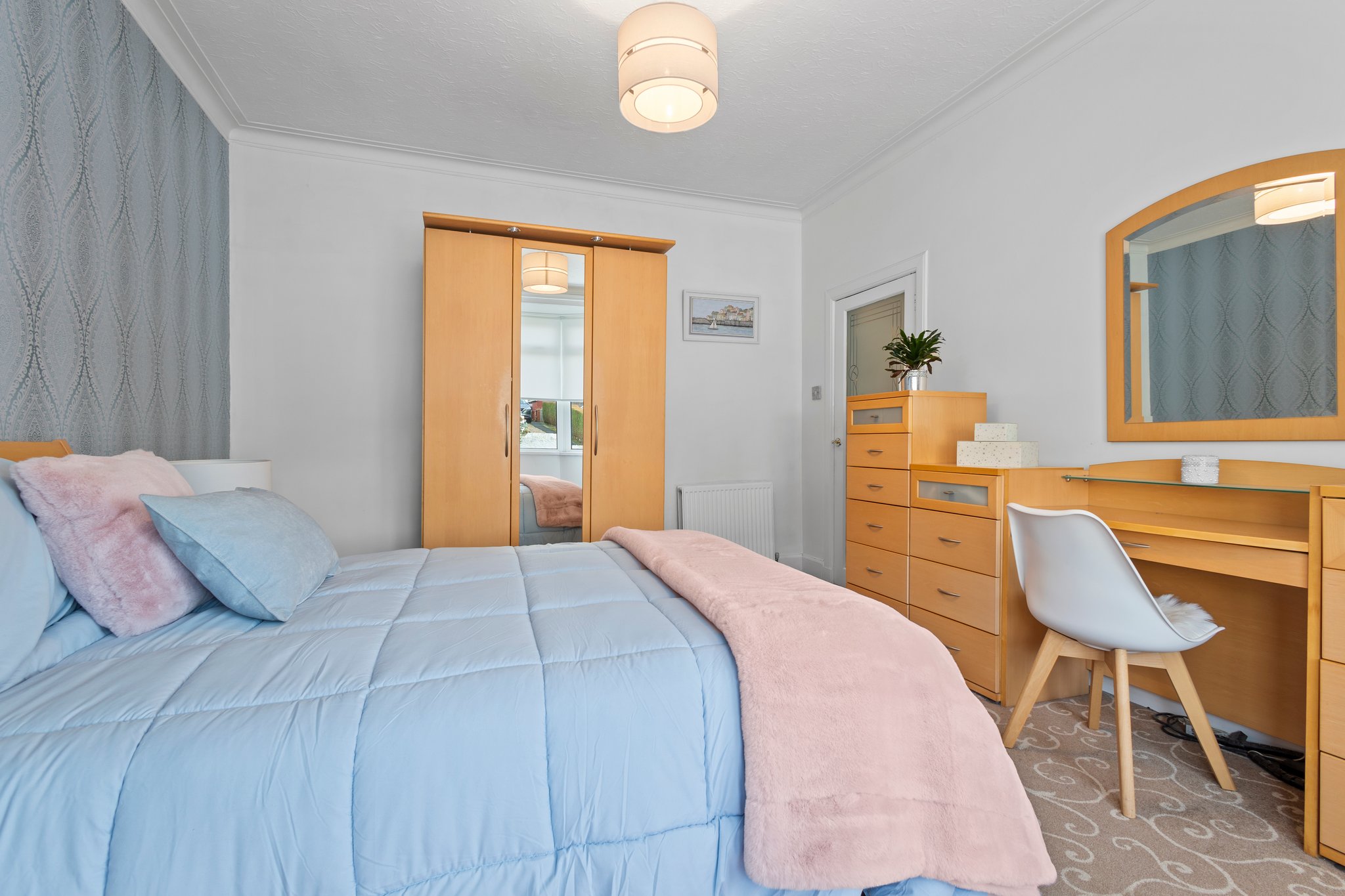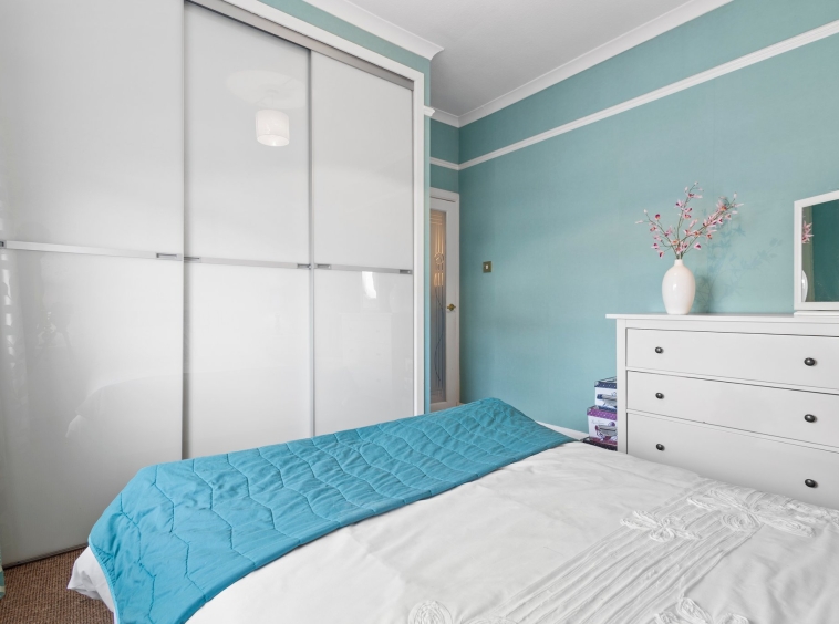 3.71m x 3.43m (12′ 2″ x 11′ 3″) Spacious double bedroom with modern decor, triple fitted wardrobes providing ample storage, ceiling cornicing, fitted carpet and a double glazed window to the front.