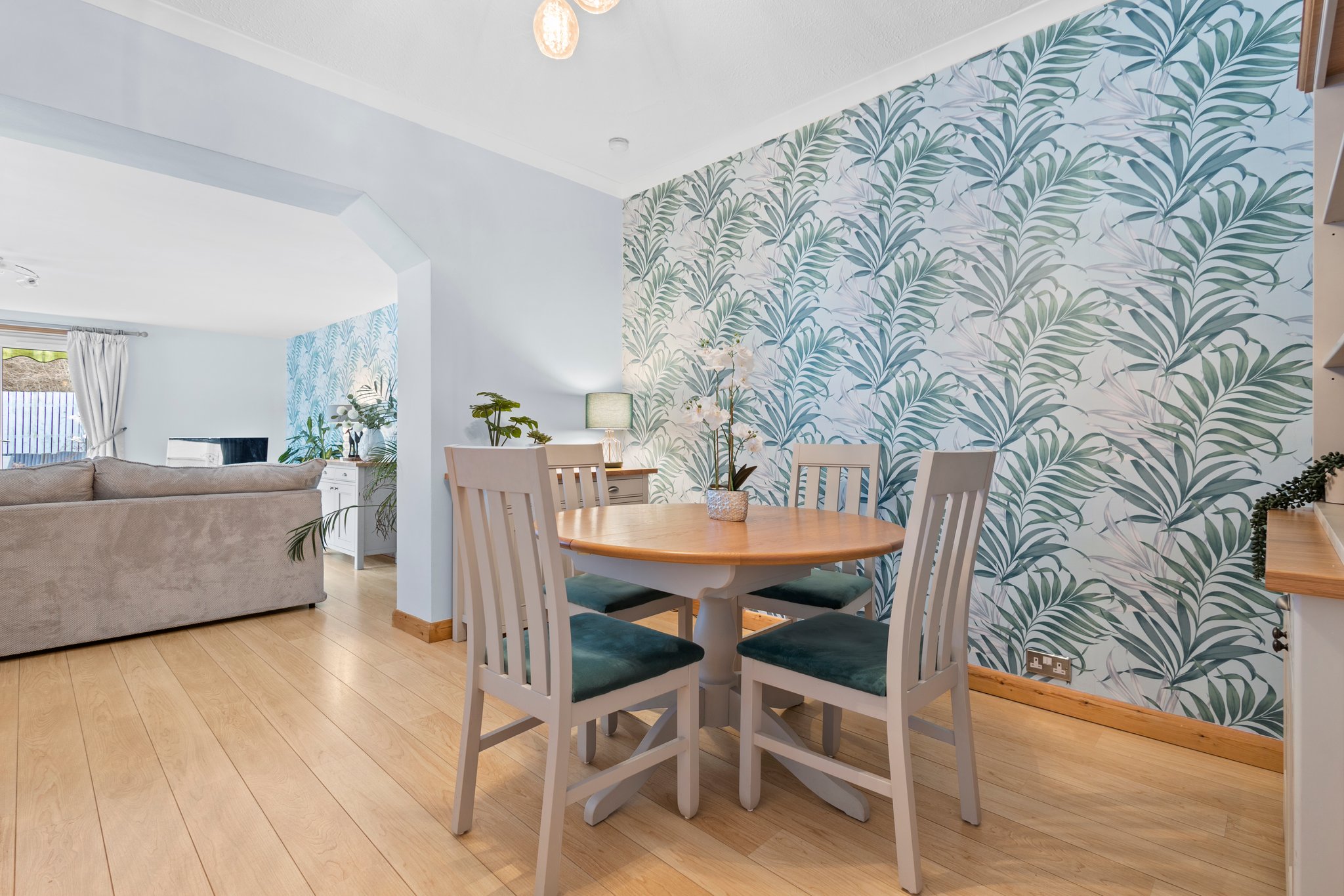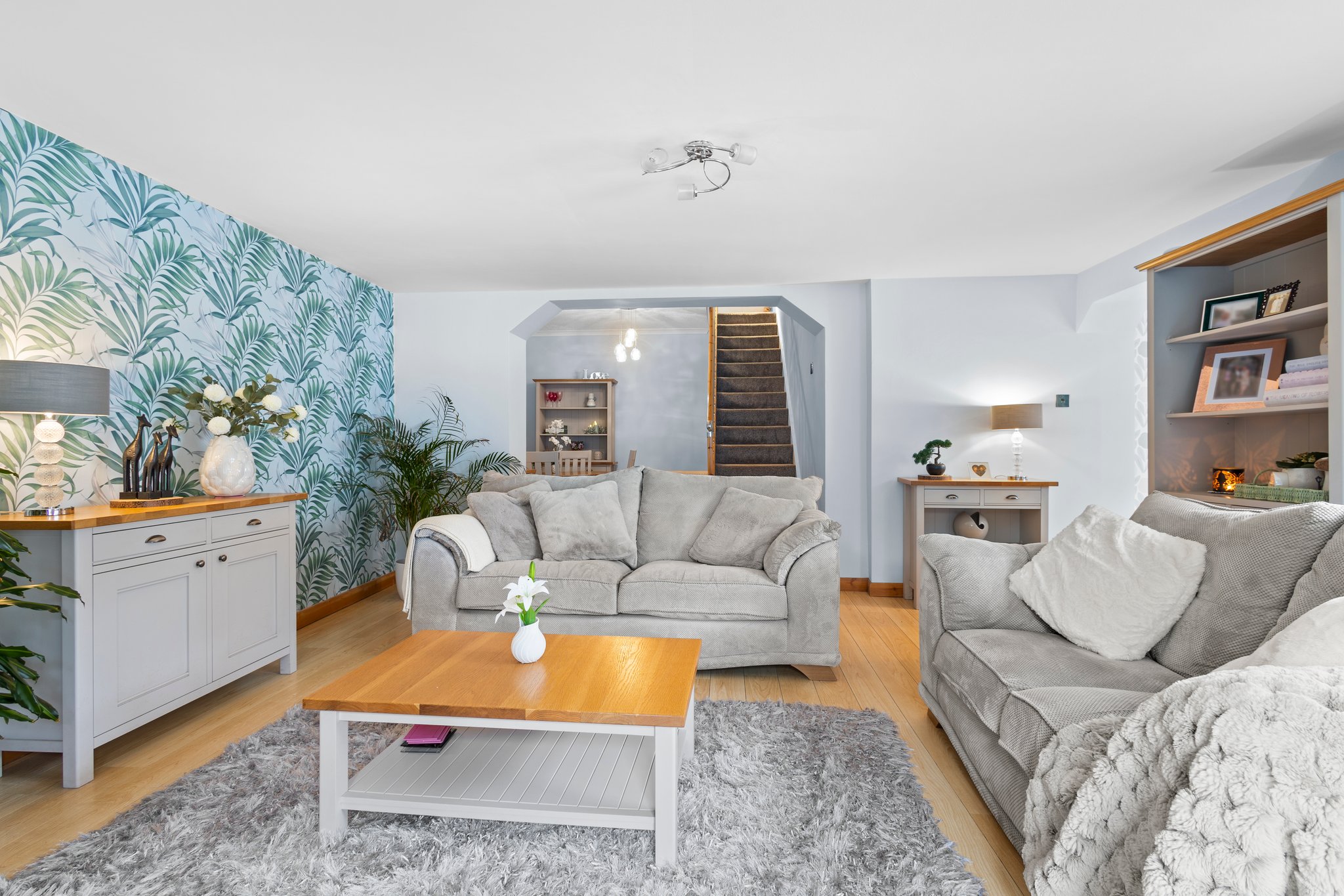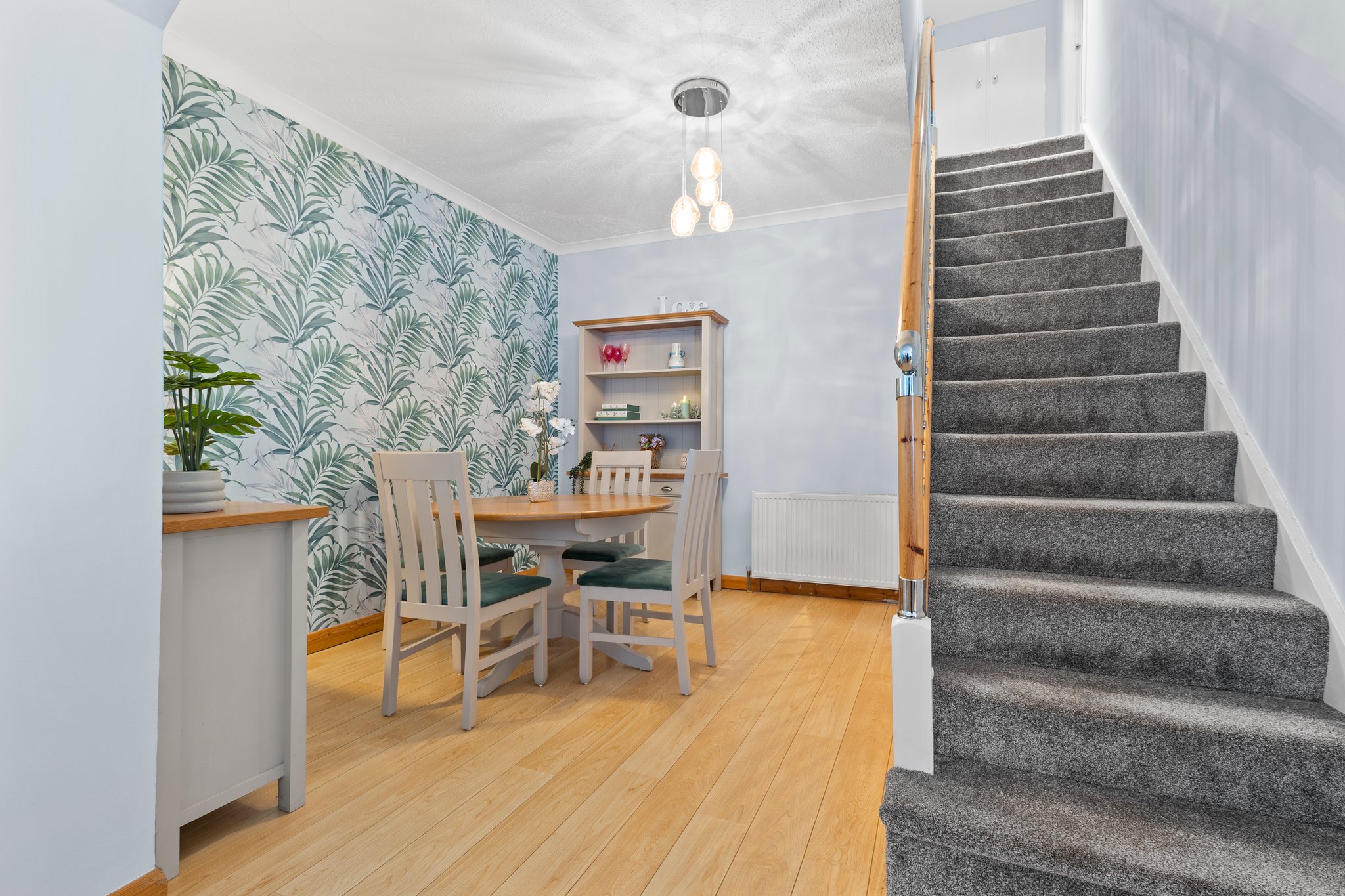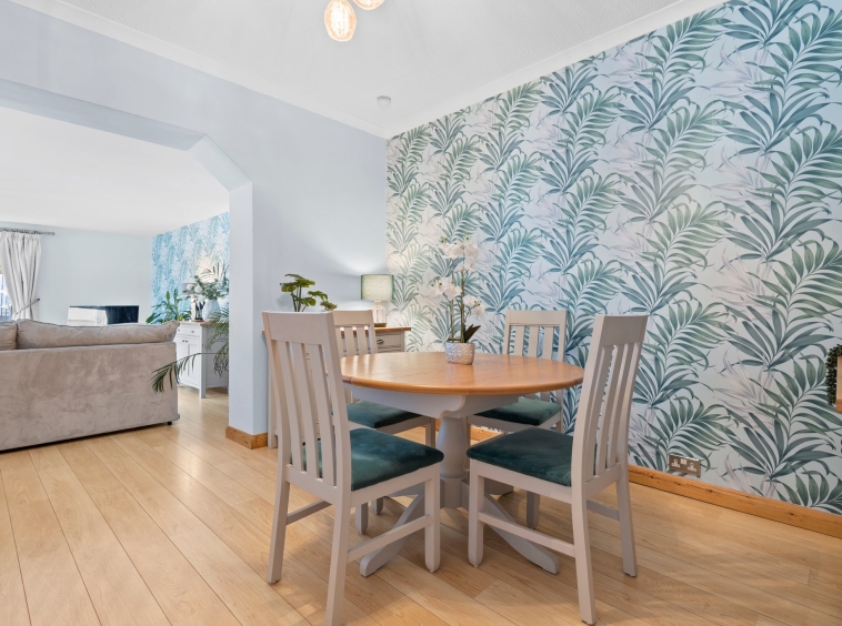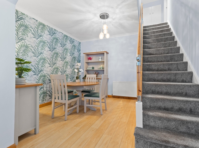 3.71m x 3.68m (12′ 2″ x 12′ 1″) Spacious apartment boasting modern decor, plentiful space for dining table and chairs, laminate flooring and a carpeted staircase leading to the upper level. Open formation to the lounge.