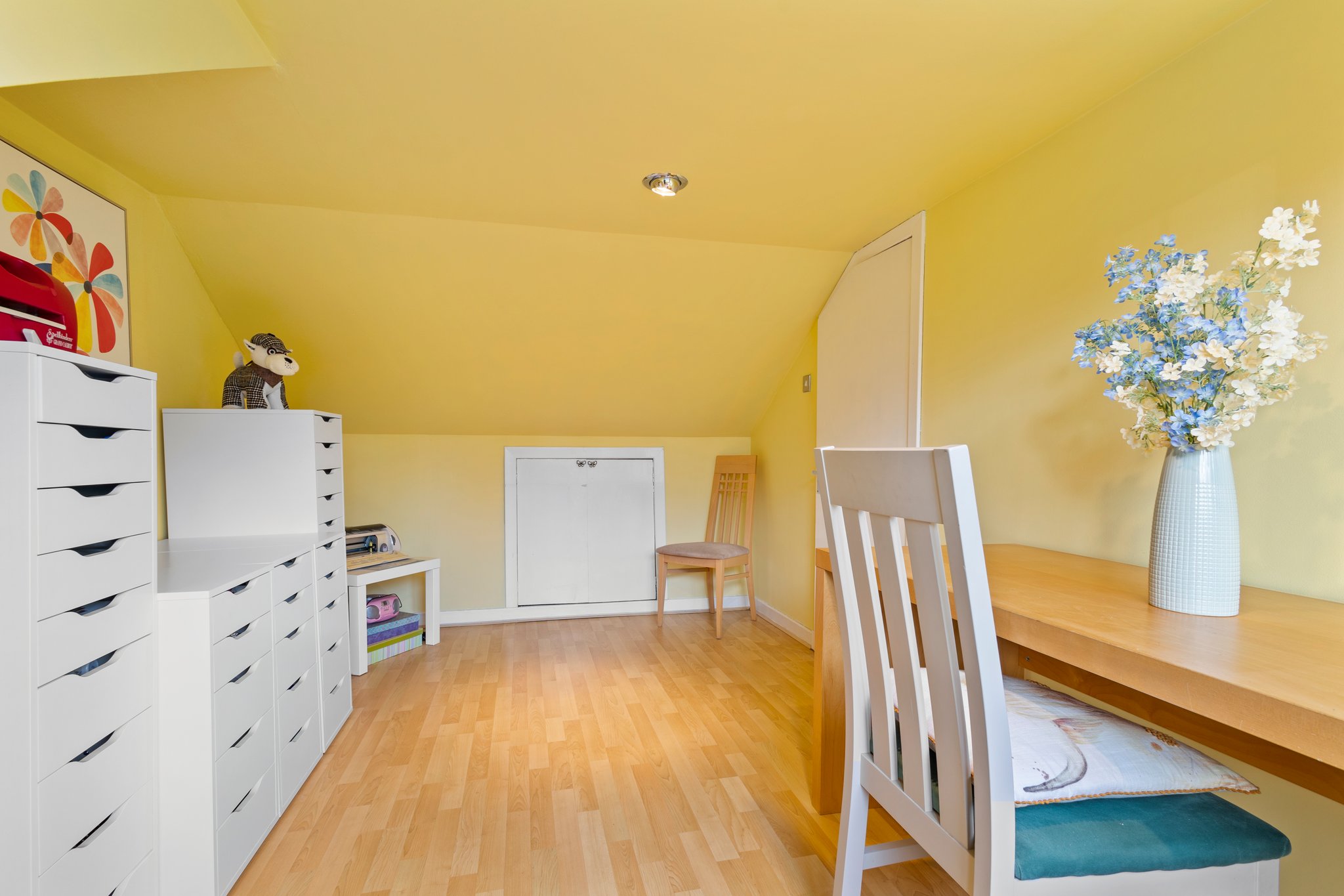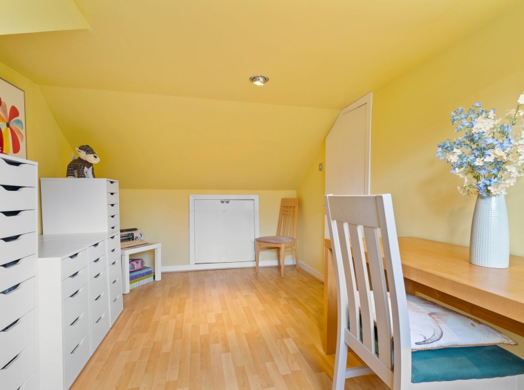 3.78m x 3.59m (12′ 5″ x 11′ 9″) Located on the upper level, bedroom three is a good sized double boasting neutral decor, laminate flooring, double glazed window to the rear and access to eaves storage.