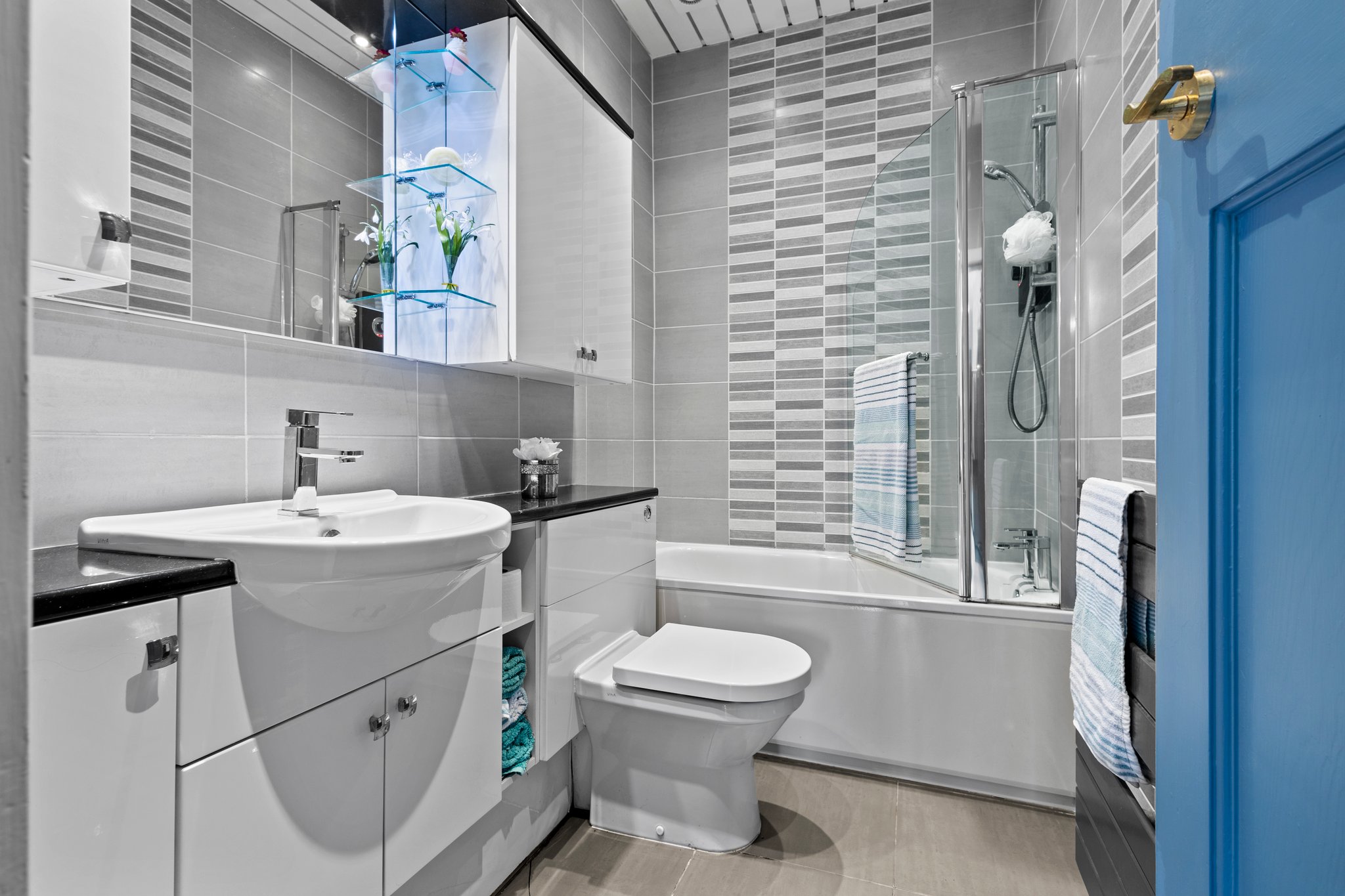 2.76m x 1.55m (9′ 1″ x 5′ 1″) On the ground floor is the family bathroom comprising of a wash hand basin with vanity storage, bath with overhead electric shower, heated towel rail, ceiling spotlights, stylish fully tiled finish and tiled flooring.