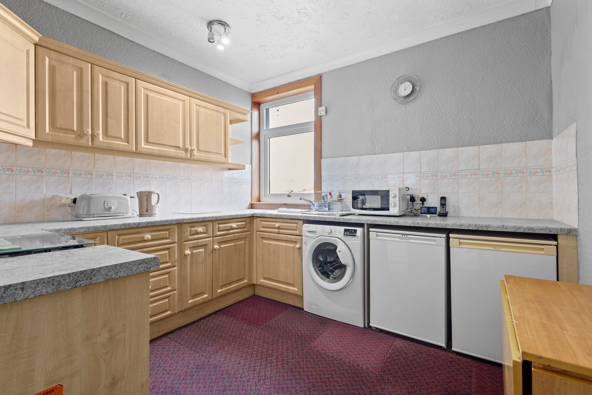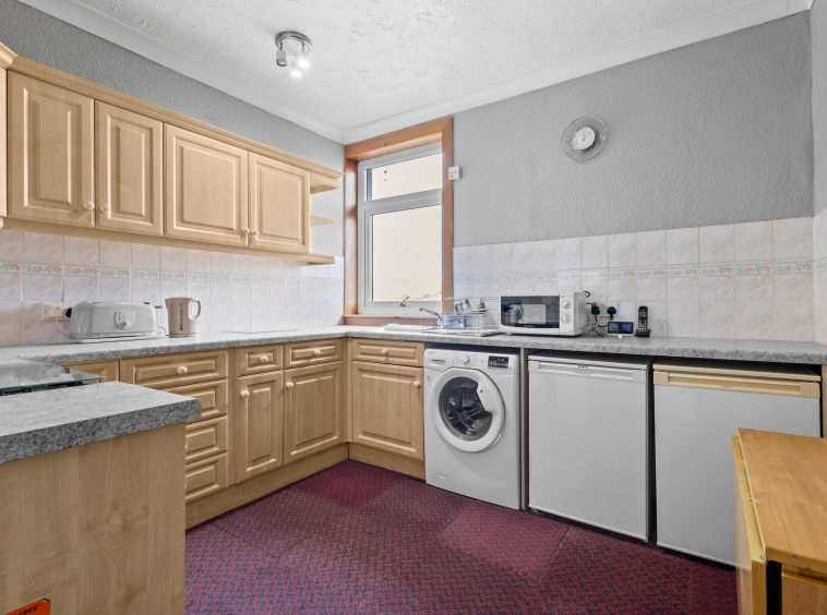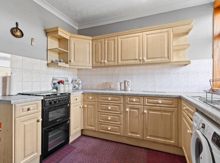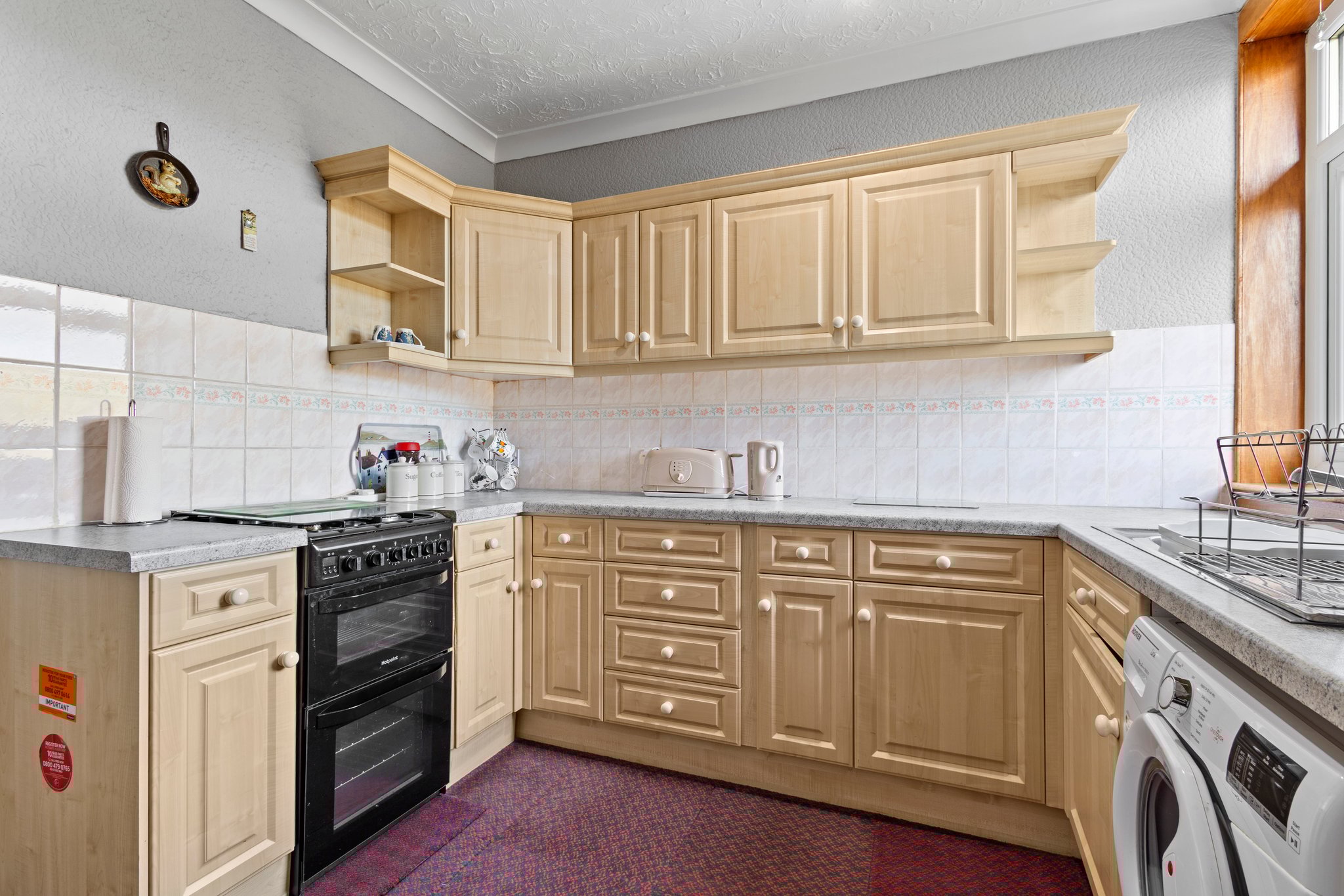 3.55m x 3.02m (11′ 8″ x 9′ 11″) Fitted kitchen offering an array of base and wall units, grey speckle work surface, space for cooker, washing machine, under counter fridge and freezer, stainless steel sink and drainer, soft decor, ceiling coving, carpeted floor, space for a small dining table and chairs, and double glazed window to the rear offering open outlooks.