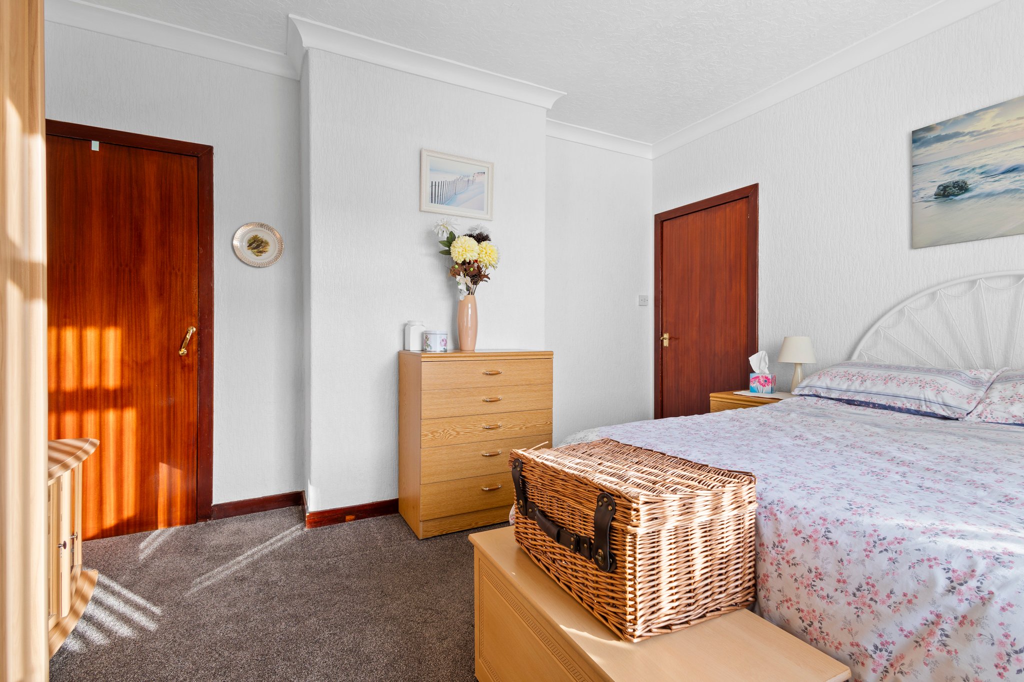 3.61m x 4.22m (11′ 10″ x 13′ 10″) Double bedroom featuring soft neutral decor, ceiling coving, fitted carpet, storage cupboard and double glazed window to the front.
