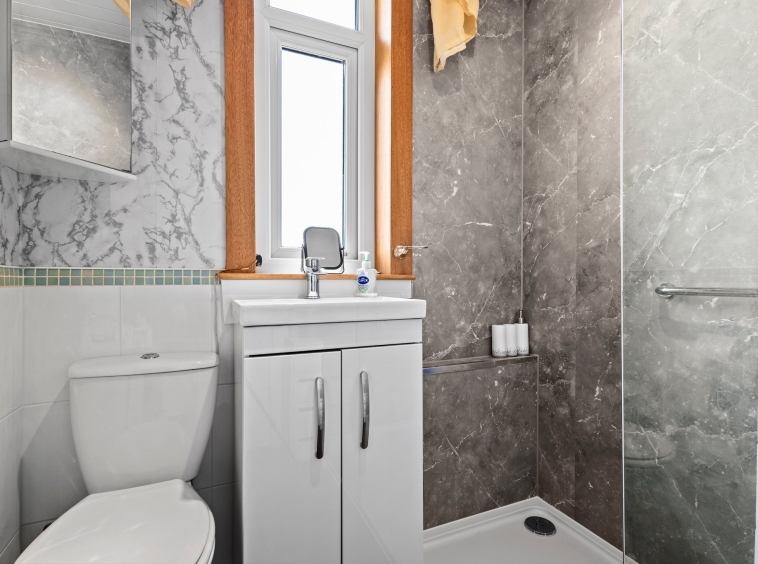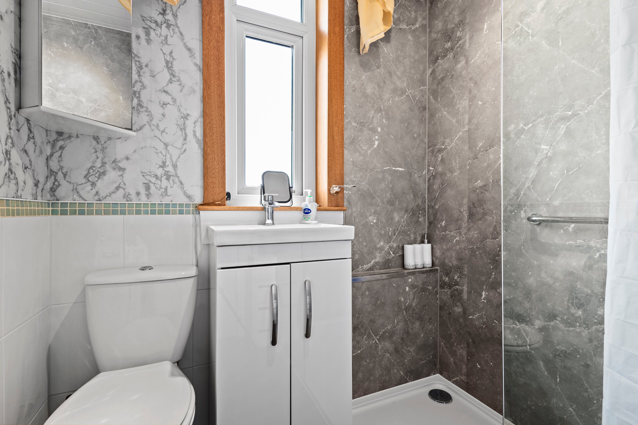 1.79m x 1.85m (5′ 10″ x 6′ 1″) Three piece fitted shower room comprising WC, wash hand basin with vanity storage, mains shower cubicle with wet wall finish, half height tiles to the wall with wet wall finish above, opaque double glazed window to the rear.