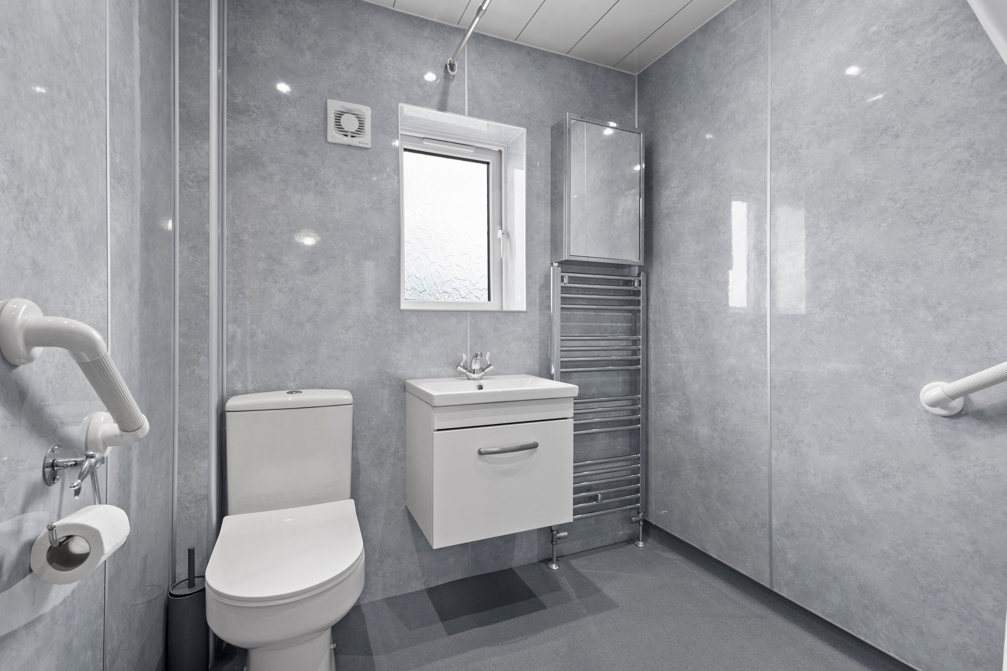 1.92m x 1.68m (6′ 4″ x 5′ 6″) Completing the accommodation is the wet room comprising of a wash hand basin, wc, mains shower, wet wall finish, ceiling spotlights, wet room flooring and a double glazed window rear.