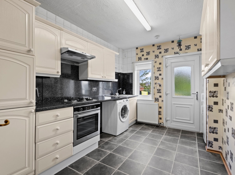 3.02m x 3.60m (9′ 11″ x 11′ 10″) Fully fitted modern kitchen complete with ample wall and base storage units with complimentary work surface, integrated oven, gas hob, stainless steel sink, plumbing and space for a dish washer, washing machine and tumble drier, stylish decor, laminate flooring, a double glazed window to the rear and a door leading to the rear garden.