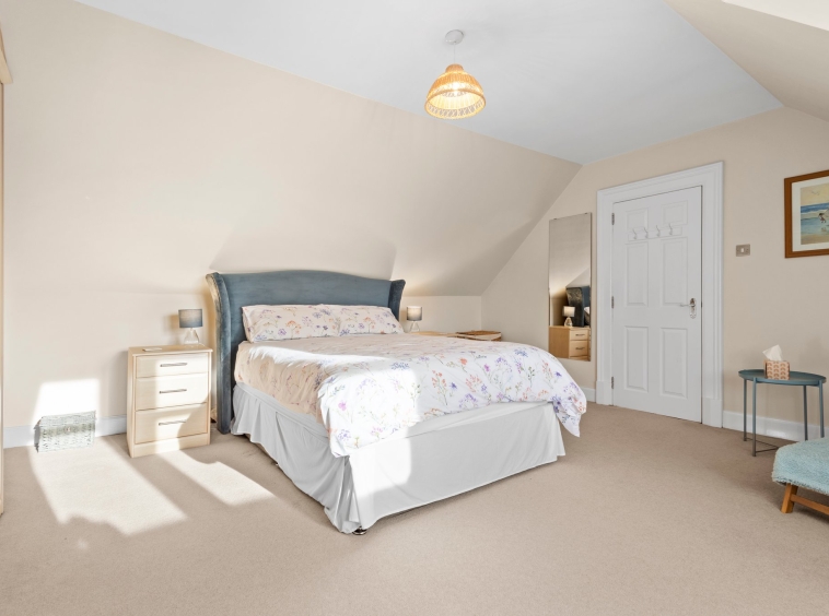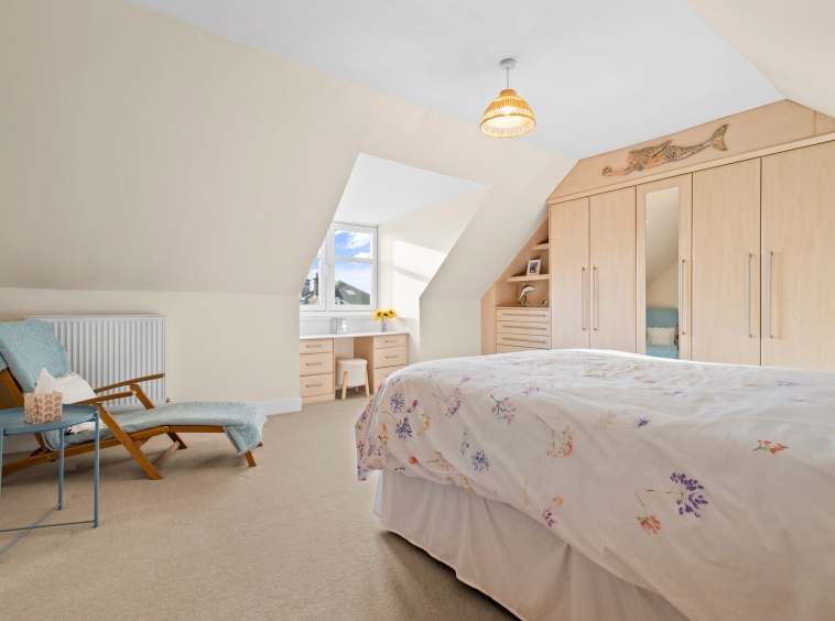 5.15m x 5.05m (16′ 11″ x 16′ 7″) Located on the upper level, the master bedroom is a sizeable double with neutral decor, fitted carpet, deep skirtings and a double glazed dormer window to the front.