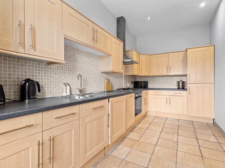 4.95m x 4.58m (16′ 3″ x 15′ 0″) Impressive sizeable main apartment offering neutral modern decor with traditional high celling, central rose and cornicing, deep skirtings, fitted carpet and a large double glazed window to the front. Door access to kitchen.