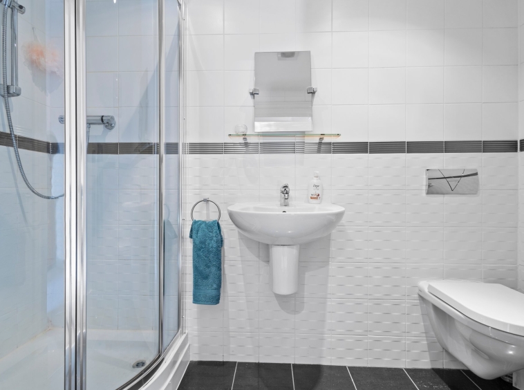 2.63m x 1.15m (8′ 8″ x 3′ 9″) Stylish three piece en-suite servicing bedroom three comprising of a wash hand basin, wc, shower cubicle with mains shower and a modern fully tiled finish.