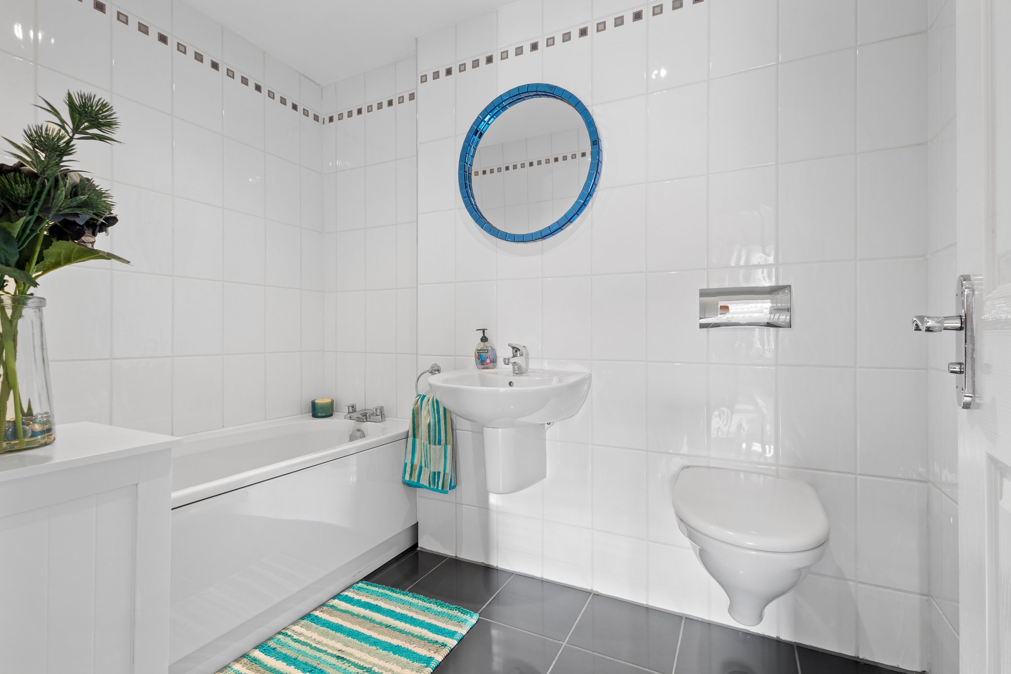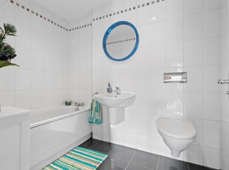 2.42m x 1.69m (7′ 11″ x 5′ 7″) Conveniently located on the lower level, the three piece family bathroom comprises of a wash hand basin, wc, bath, neutral tiling, ceiling spotlights and tiled flooring.