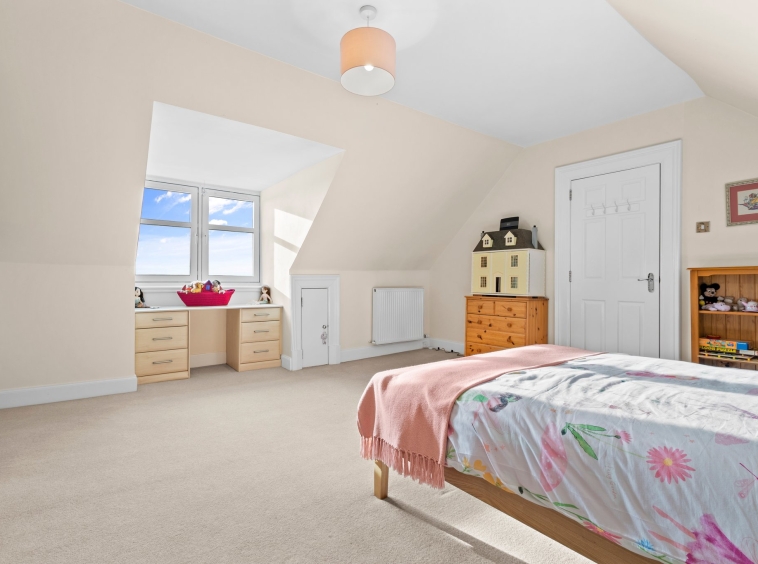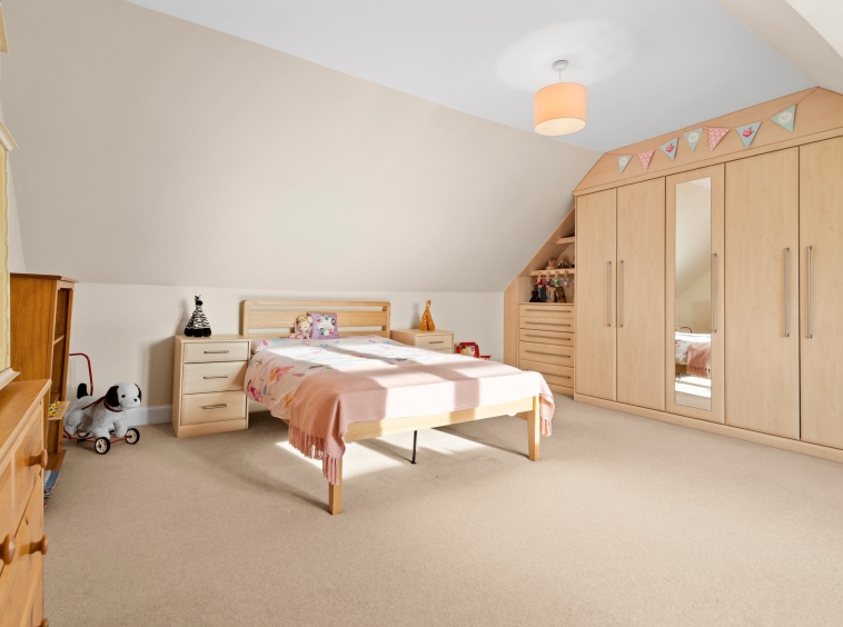 5.15m x 5.07m (16′ 11″ x 16′ 8″) Bedroom two is a spacious double with modern decor, access to eaves storage, deep skirtings, fitted carpet and a double glazed dormer window to the front.