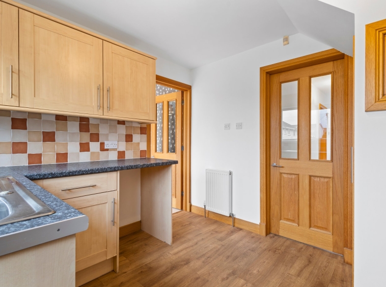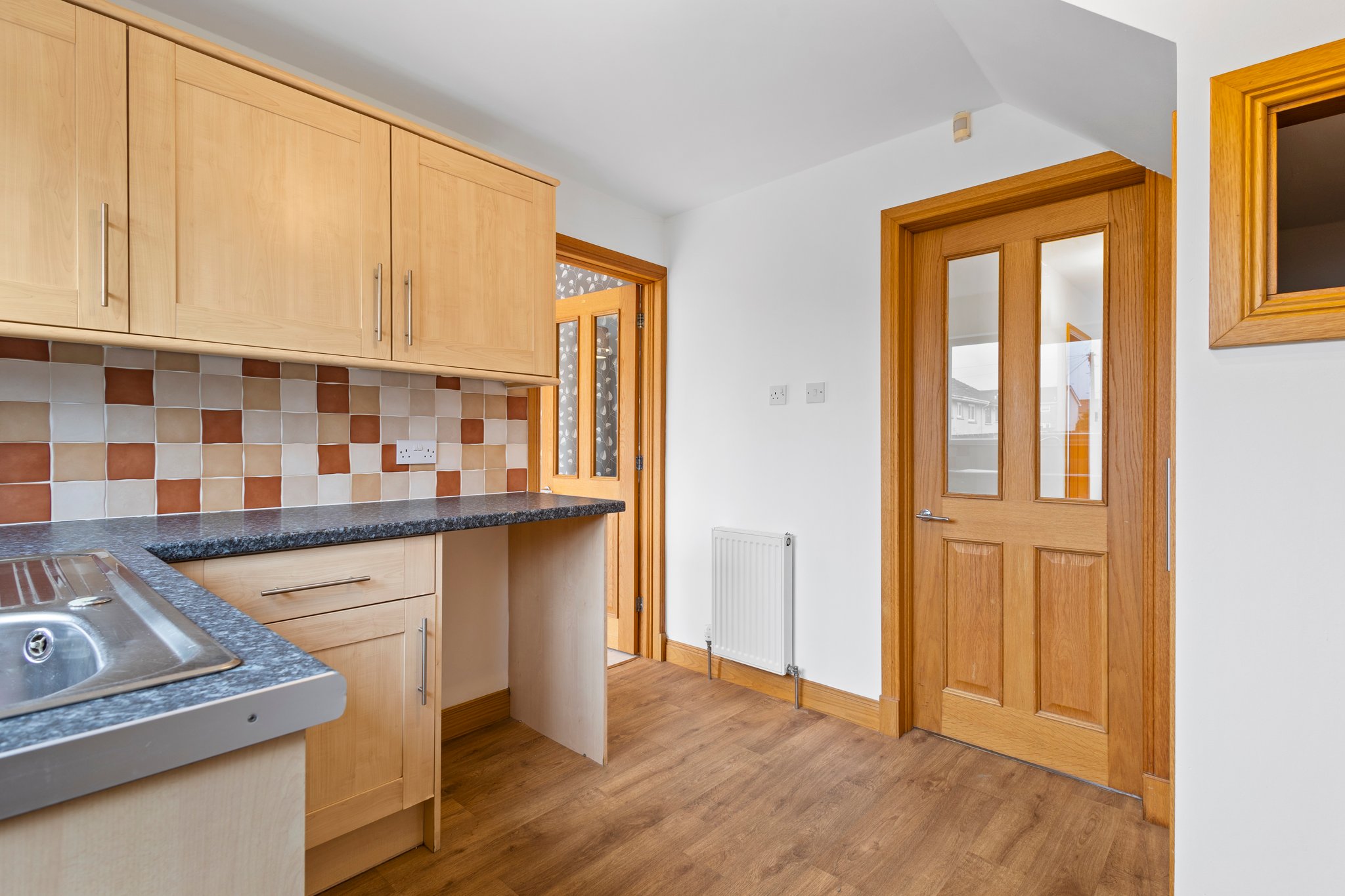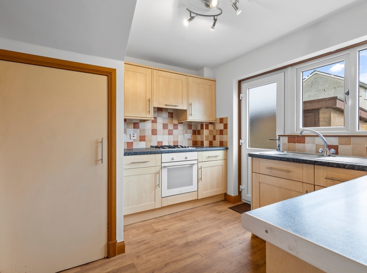 3.19m x 2.90m (10′ 6″ x 9′ 6″) Fully fitted kitchen complete with ample wall and base storage units with complimentary work surface, integrated oven, gas hob, stainless steel sink and drainer, plumbing and space for a washing machine, neutral decor, vinyl flooring, a double glazed window to the rear and a door leading to the gardens.