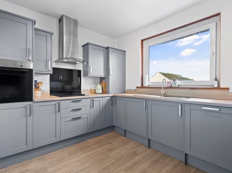 2.92m x 3.94m (9′ 7″ x 12′ 11″) Modern fitted kitchen offering an array of grey wall and base units, contrasting worksurface, integrated electric hob with glass anthracite splash back, integrated oven, dishwasher and washing machine, space for a fridge freezer, composite sink and drainer, laminate flooring and double glazed window to the rear.