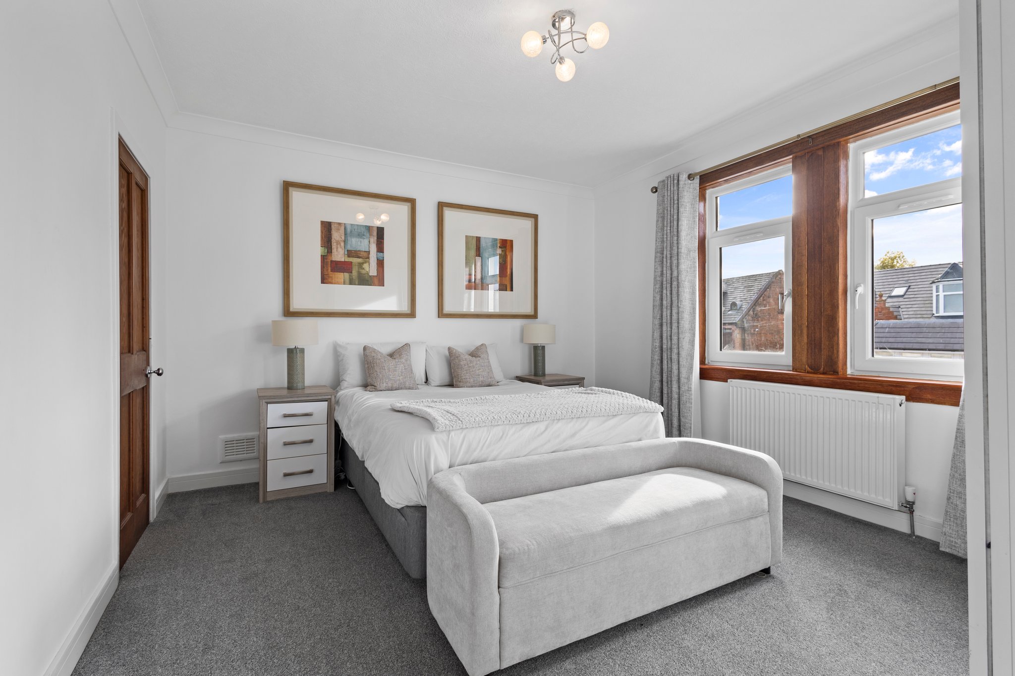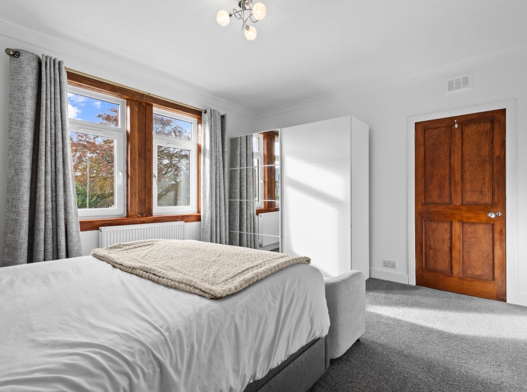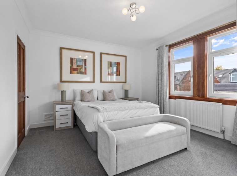 3.69m x 4.31m (12′ 1″ x 14′ 2″) Spacious double bedroom boasting neutral decor, ceiling coving, fitted carpet, storage cupboard and double glazed windows to the front.