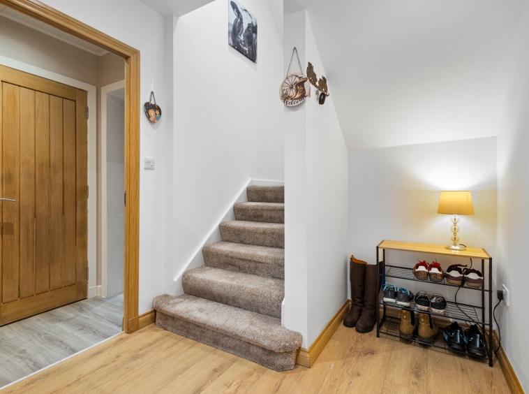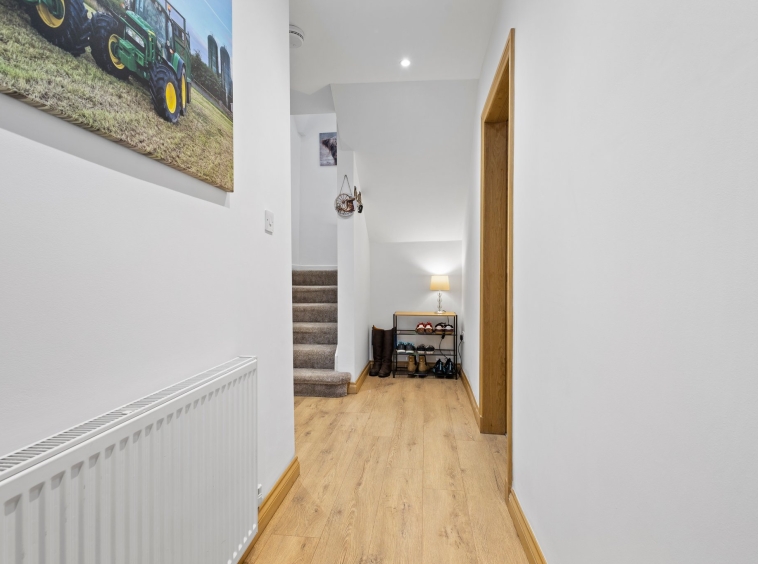2.17m x 4.76m (7′ 1″ x 15′ 7″) Access is given to a spacious welcoming hallway boasting modern decor and laminate flooring. The hallway gives access to the lounge, sitting/family room, dining room/bedroom four, bathroom and a carpeted staircase leads to the upper level.