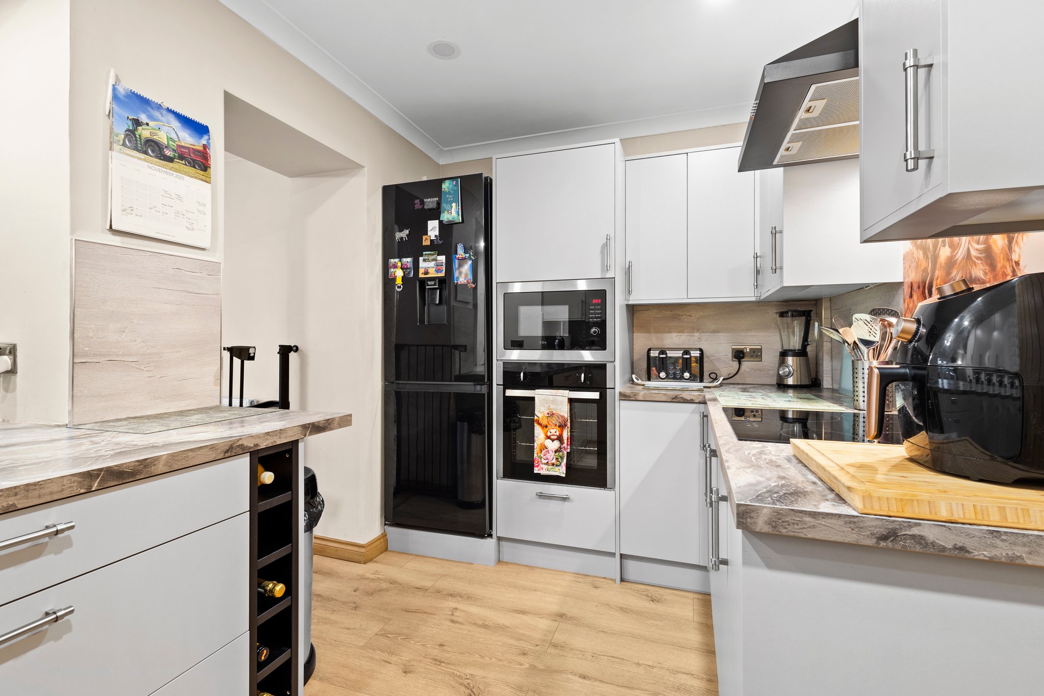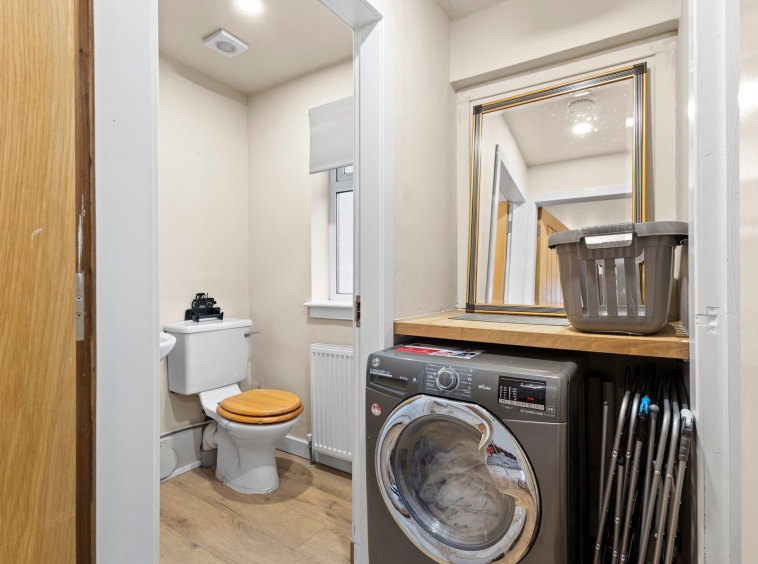 1.39m x 0.90m (4′ 7″ x 2′ 11″) Practical utility area comprising of additional work counter space, plumbing and space for washing machine, neutral decor, Lamiante flooring and a door leading to the wc.