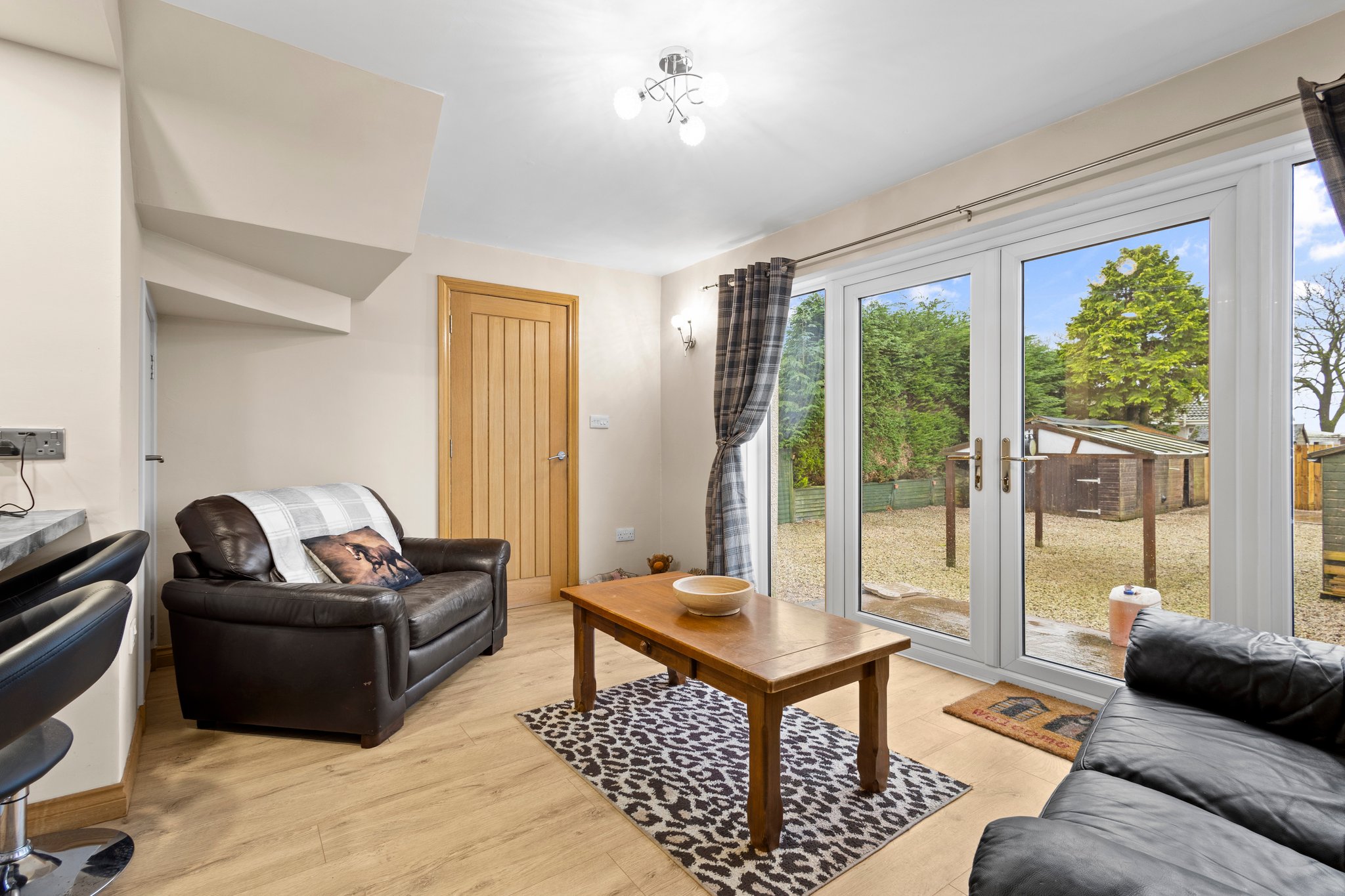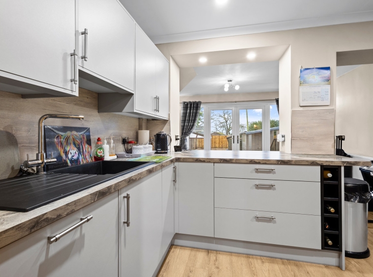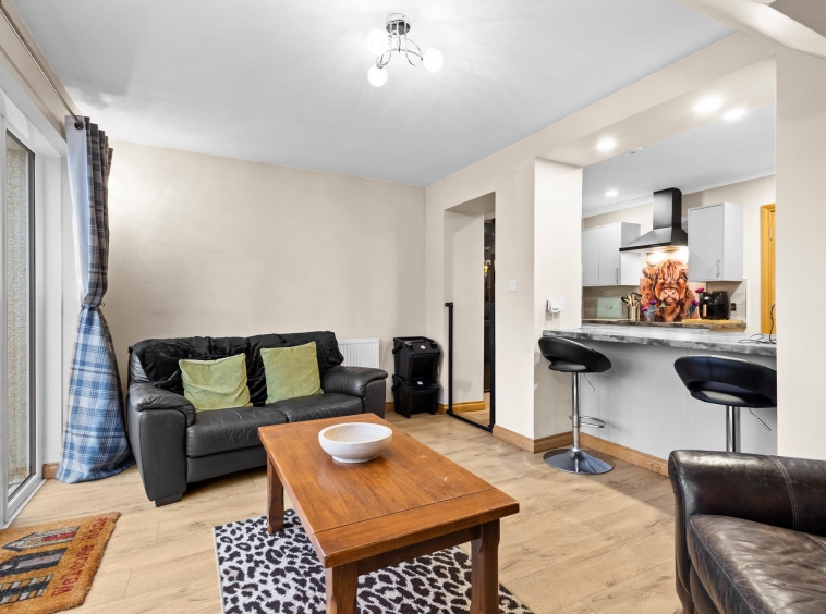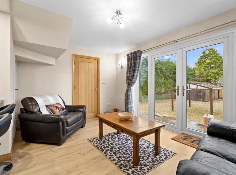 4.42m x 2.91m (14′ 6″ x 9′ 7″) Complete with an open plan layout to the kitchen, a spacious second apartment offering neutral decor, practical storage cupboard, laminate flooring and double glazed patio doors overlooking and providing access to the rear garden.