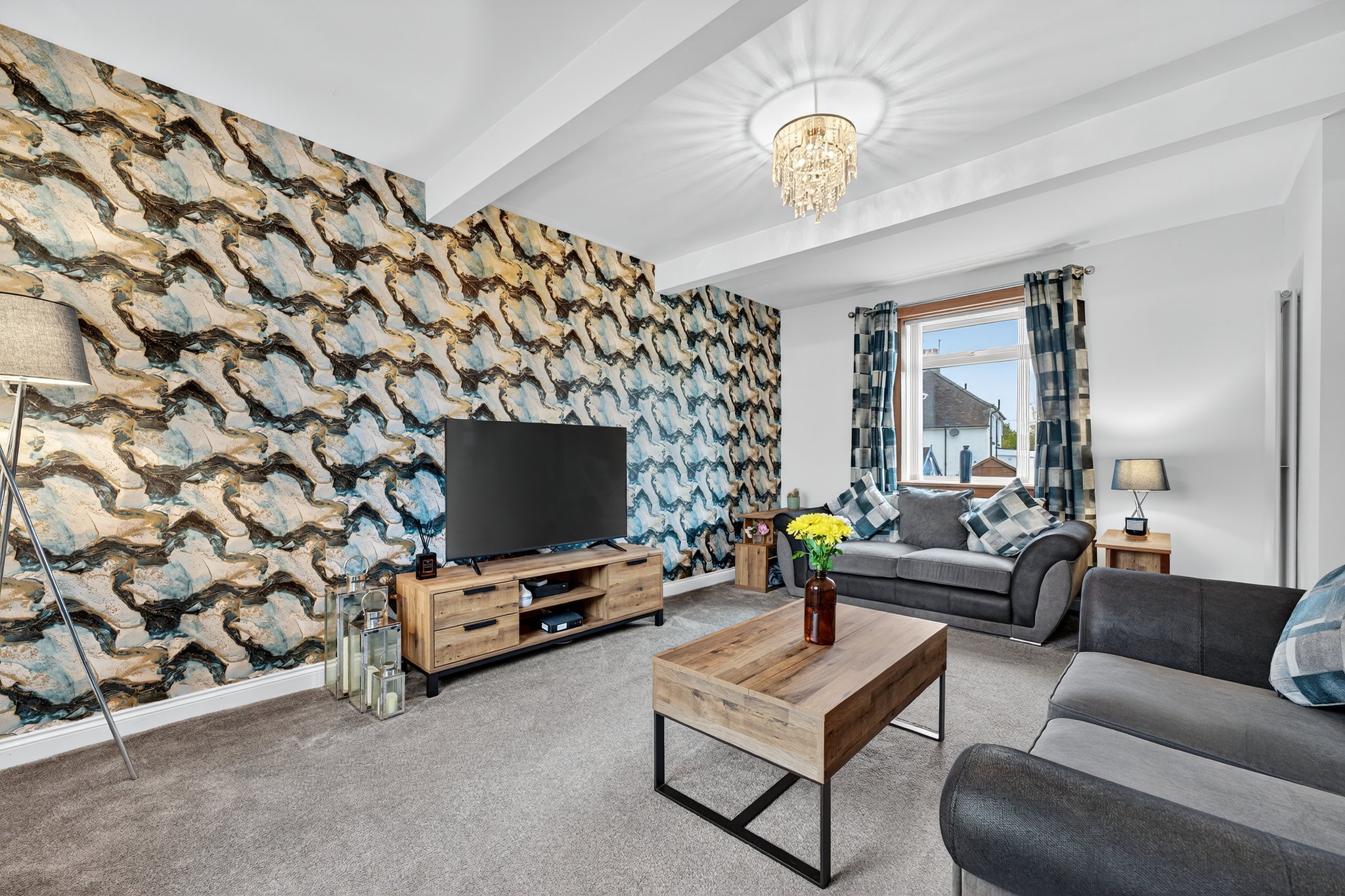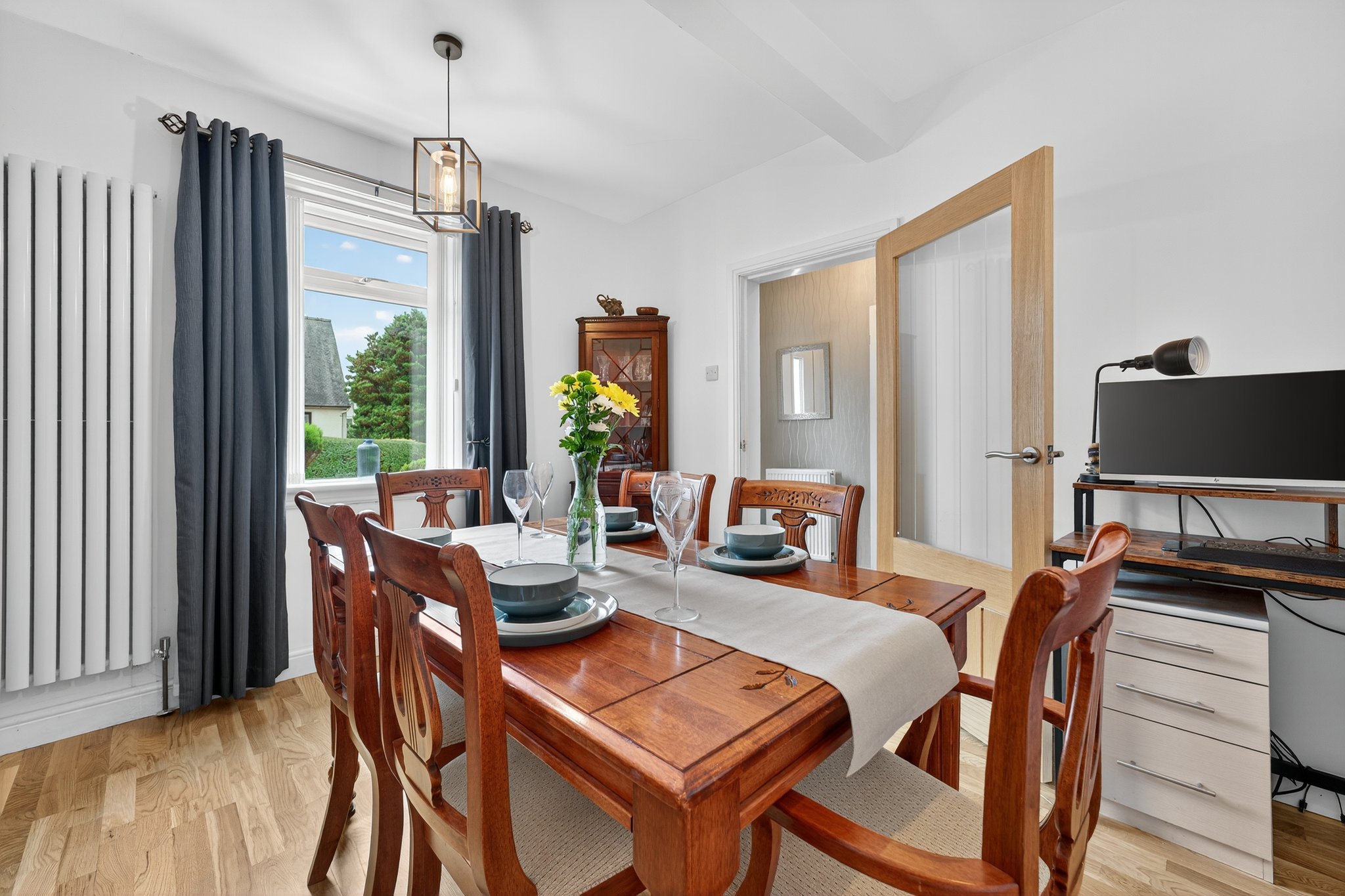 Positioned on an extensive corner plot, this family home boasts generous garden grounds to the front and rear. The front gardens comprise of a manicured lawn with chipped borders, paved pathway and large monobloc driveway providing plentiful off street parking for several vehicles. The rear gardens are laid to lawn with chips and patio area, enclosed by fencing allowing for a safe and peaceful outdoor space.