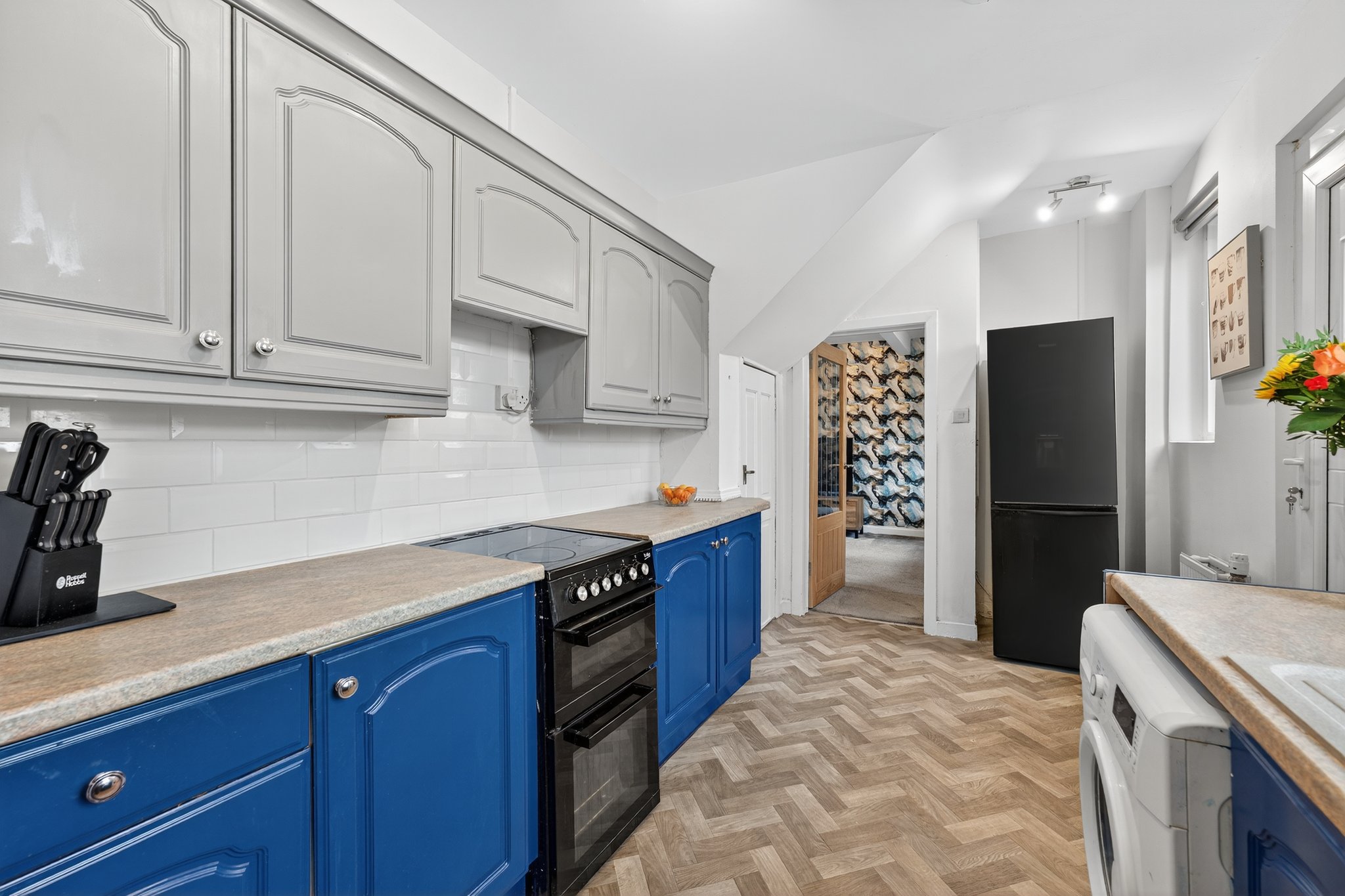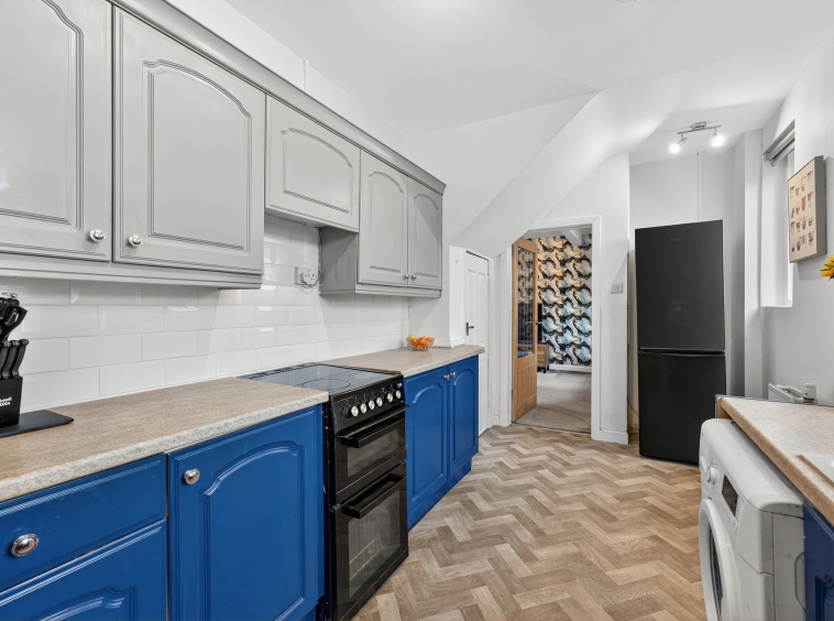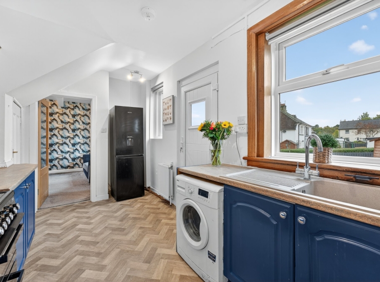 4.09m x 2.44m (13′ 5″ x 8′ 0″) The spacious fitted kitchen is complete with a range of modern wall and base storage units with complementary work surfaces, composite sink and drainer, plumbing/space for cooker, washing machine and fridge/freezer. Neutral decor, vinyl flooring, double glazed window to the rear and door leading out into the rear gardens.