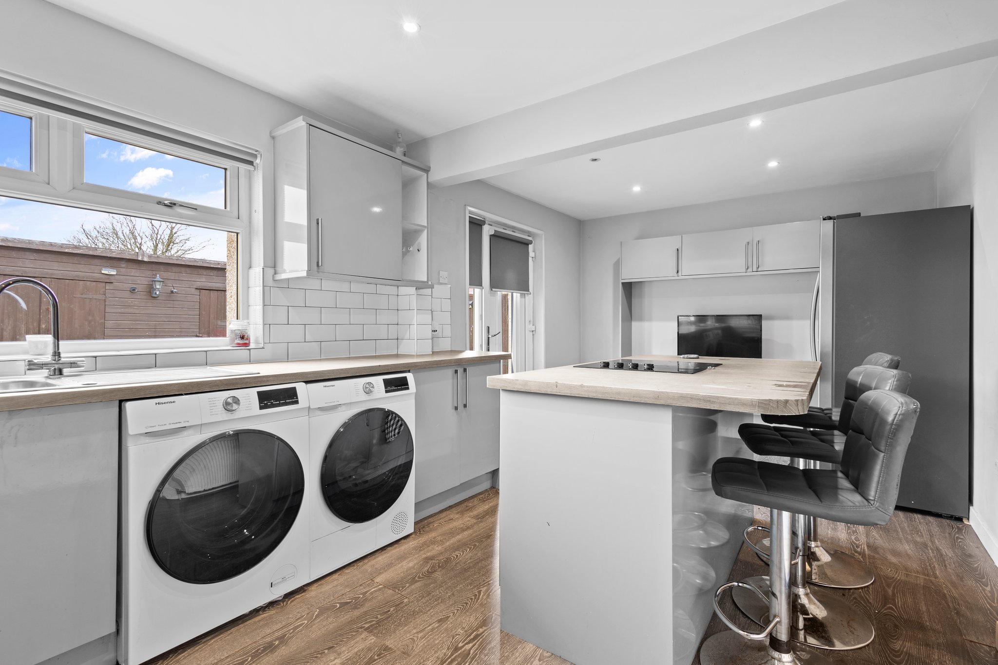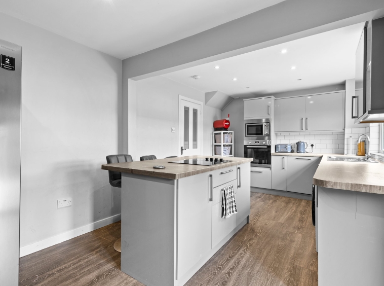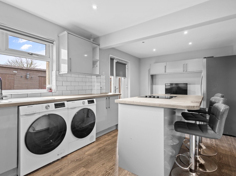 5.85m x 3.03m (19′ 2″ x 9′ 11″) Large kitchen/diner offering an array of fitted wall and base units, oak effect work surfaces, middle island with electric hob and breakfast bar, integrated oven and microwave, plumbing space for washing machine, tumble drier, American style fridge freezer. With modern neutral decor, white tiled splash back, ceiling spotlights, laminate flooring, double glazed window to the rear and external UPVC door to the rear garden.