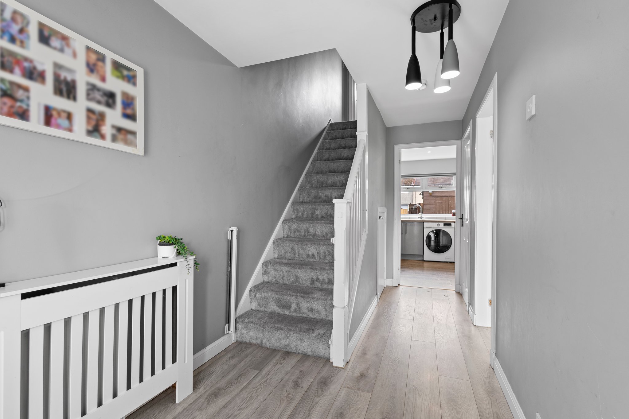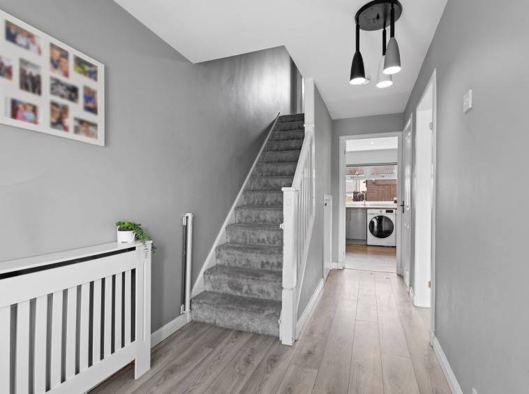 1.90m x 4.78m (6′ 3″ x 15′ 8″) Bright and welcoming hallway accessed via the outer white UPVC door with a double glazed window to the side, grey modern decor, laminate flooring, two storage cupboards, door access to the kitchen and livingroom, carpeted staircase to the upper level.