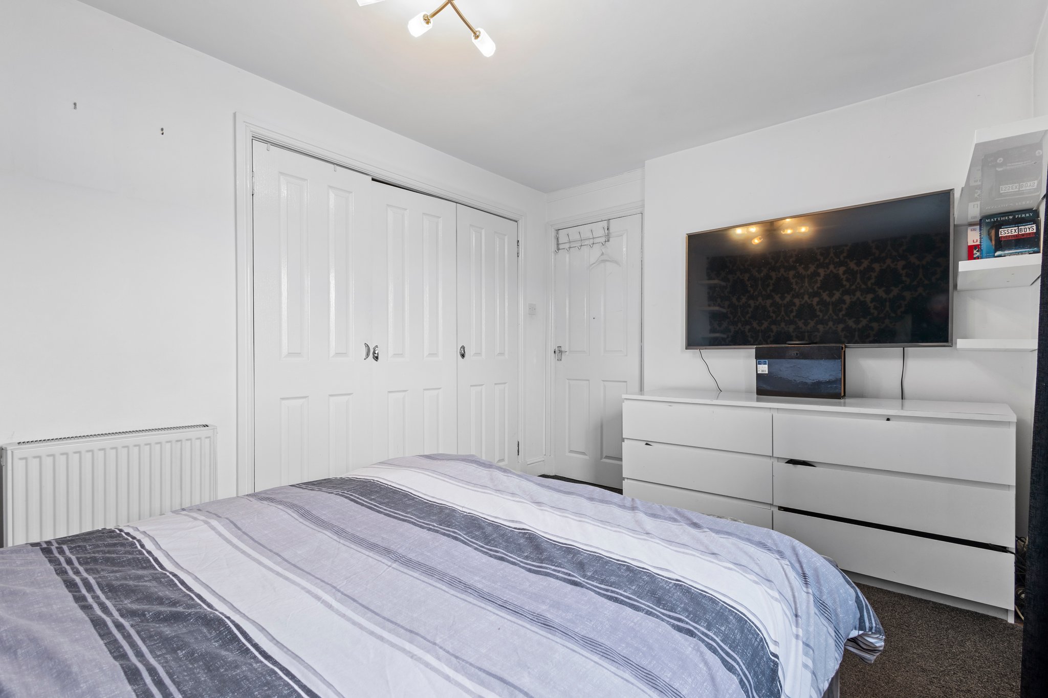 3.85m x 2.72m (12′ 8″ x 8′ 11″) Double bedroom featuring contemporary decor, fitted carpet, triple fitted wardrobes and a double glazed window to the rear.