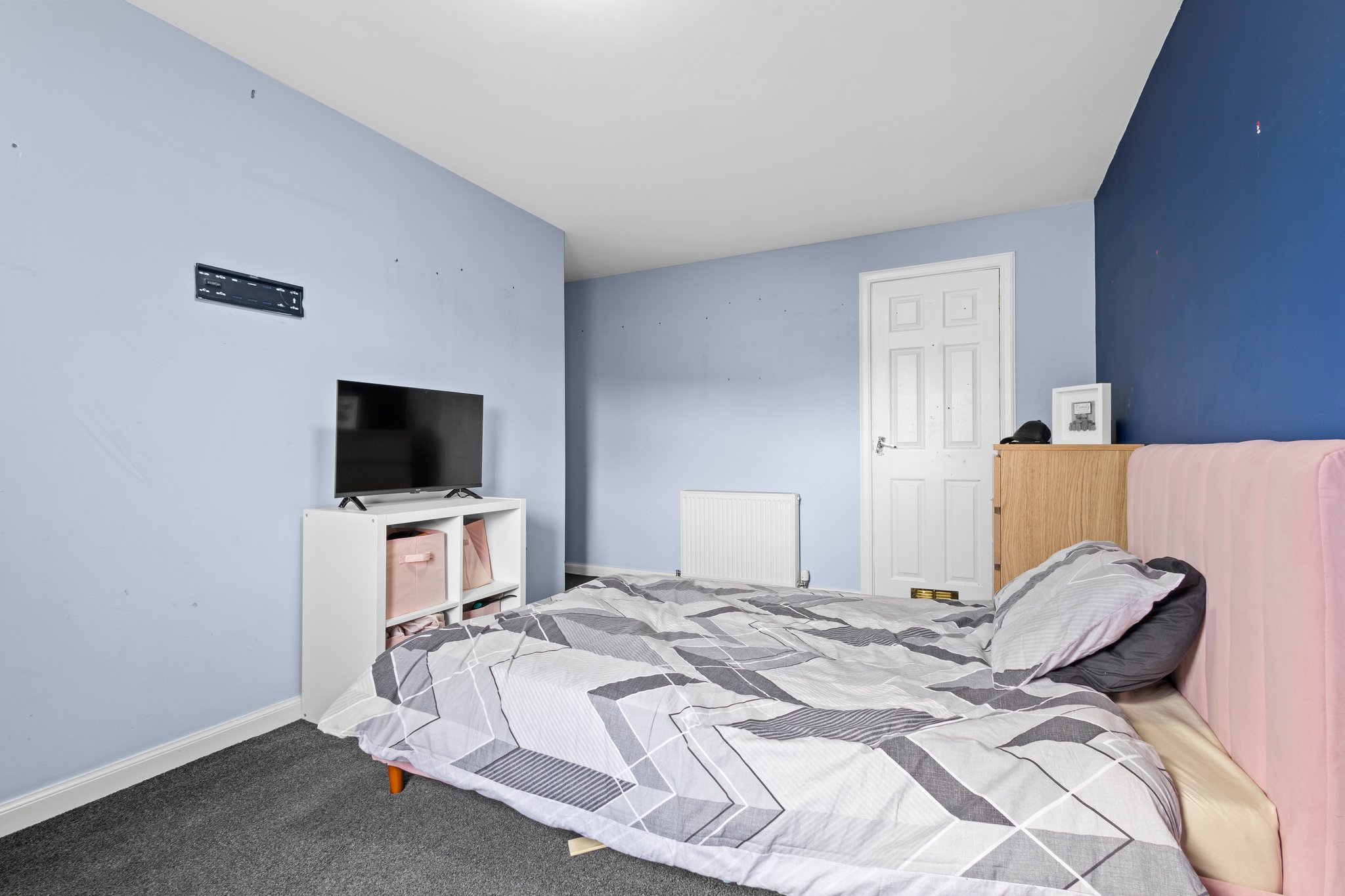 2.97m x 3.43m (9′ 9″ x 11′ 3″) Double bedroom featuring modern pink and grey decor, fitted carpet and double glazed window to the front.