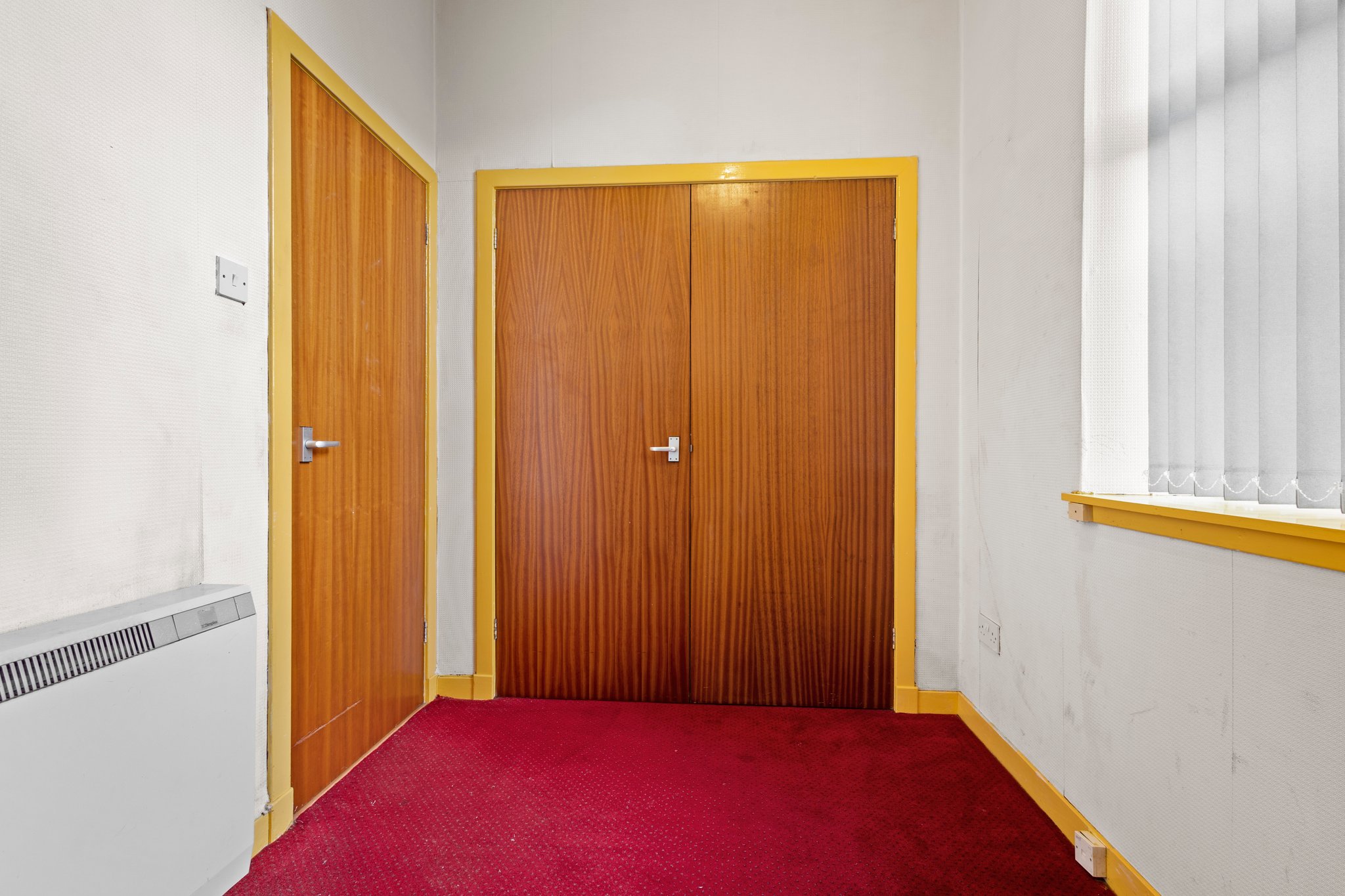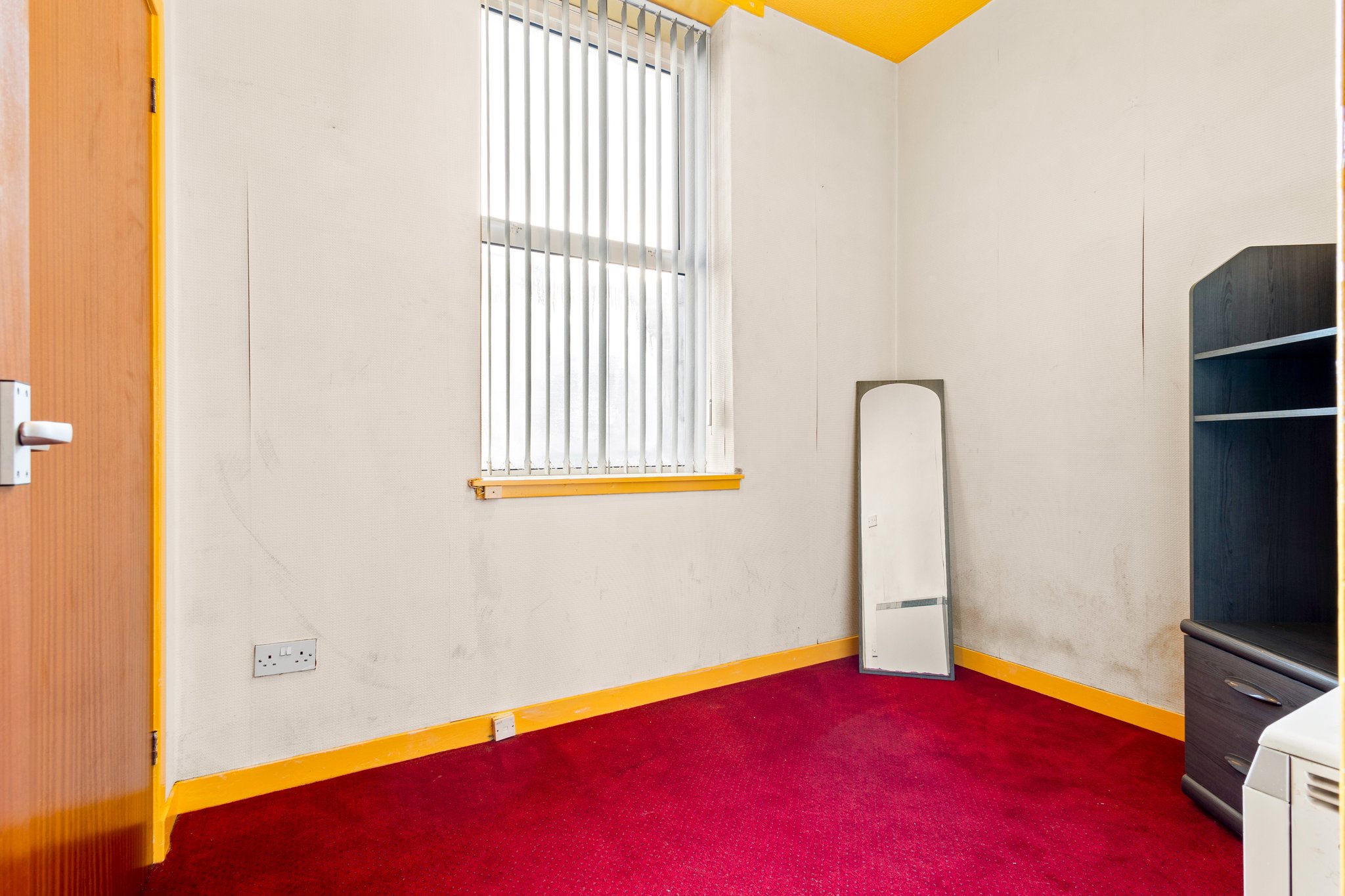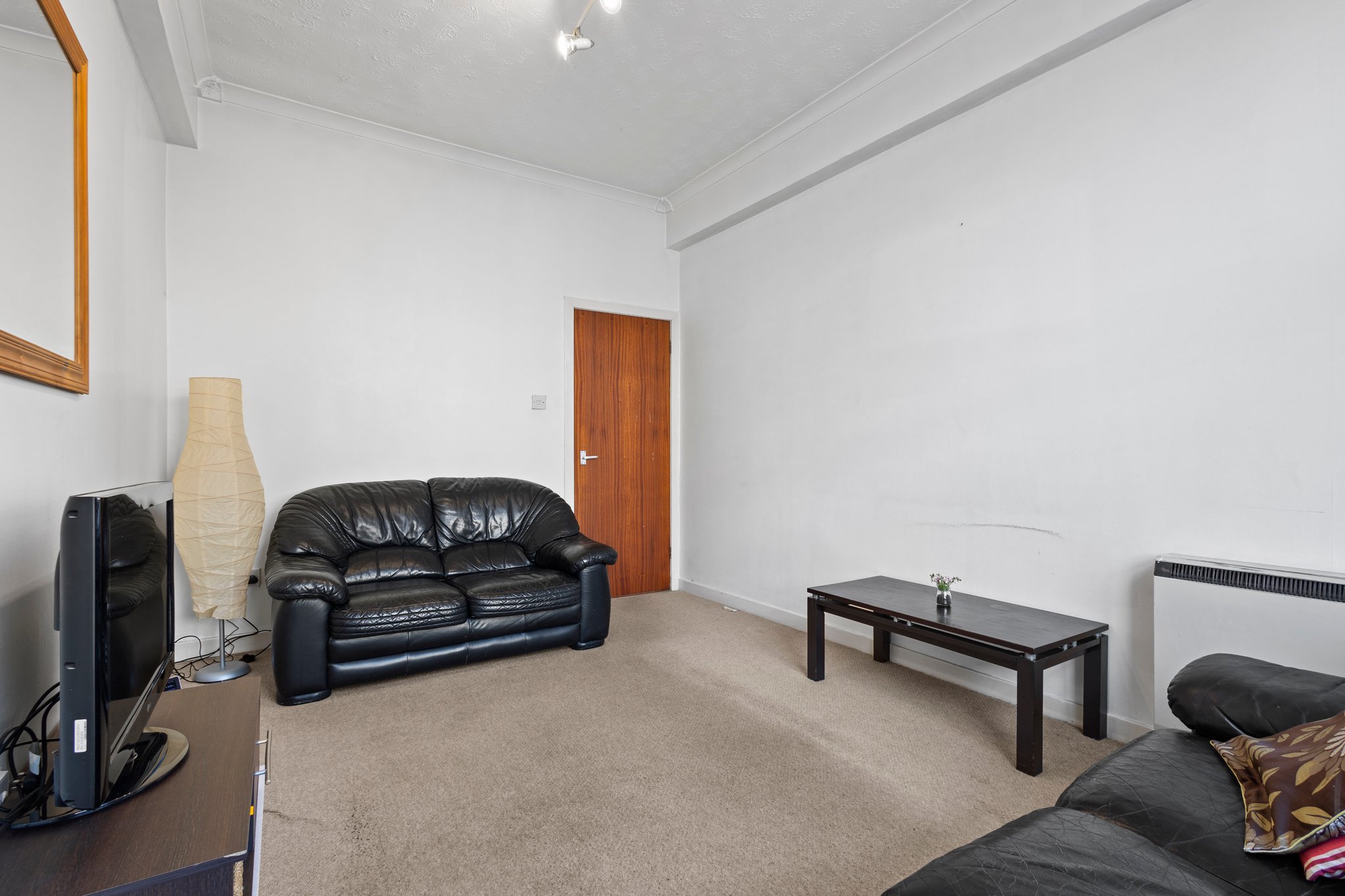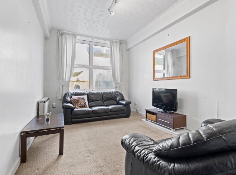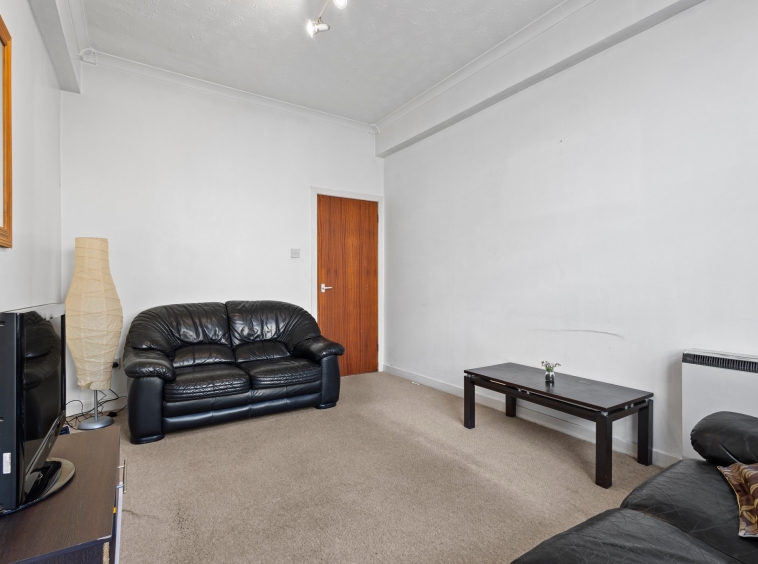 4.39m x 3.03m (14′ 5″ x 9′ 11″) Generously proportioned main apartment offering neutral decor, traditional high ceiling and coving, fitted carpet and two large double glazed windows to the front.
