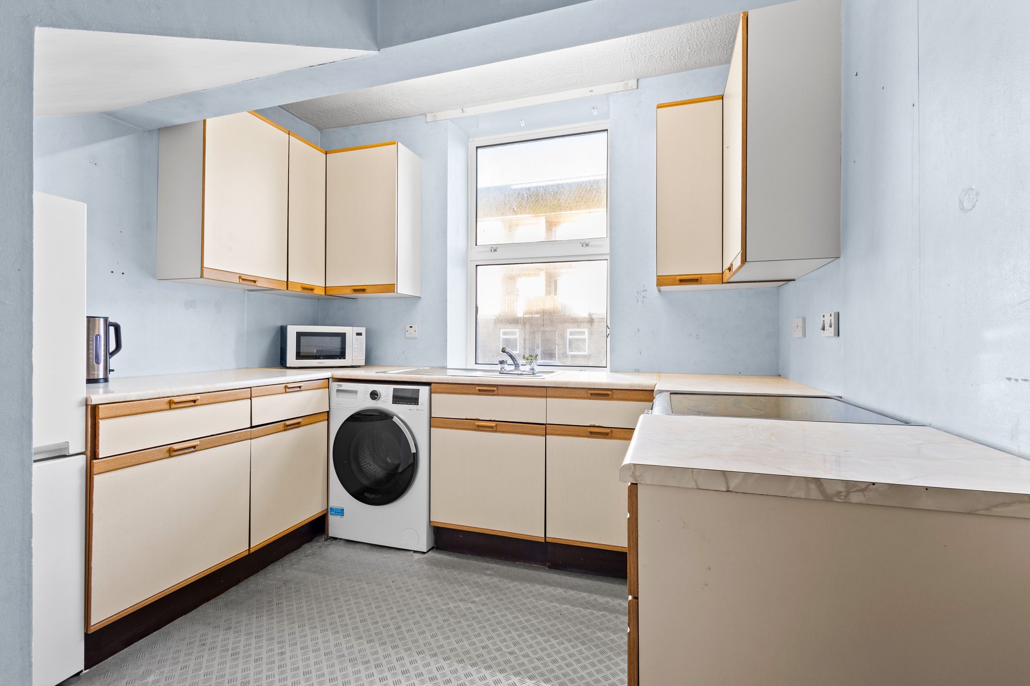 2.93m x 2.89m (9′ 7″ x 9′ 6″) Fully fitted kitchen complete with ample wall and base storage, complimentary work surface, plumbing and space for cooker, fridge freezer and washing machine, neutral decor, vinyl flooring and a double glazed window to the front.