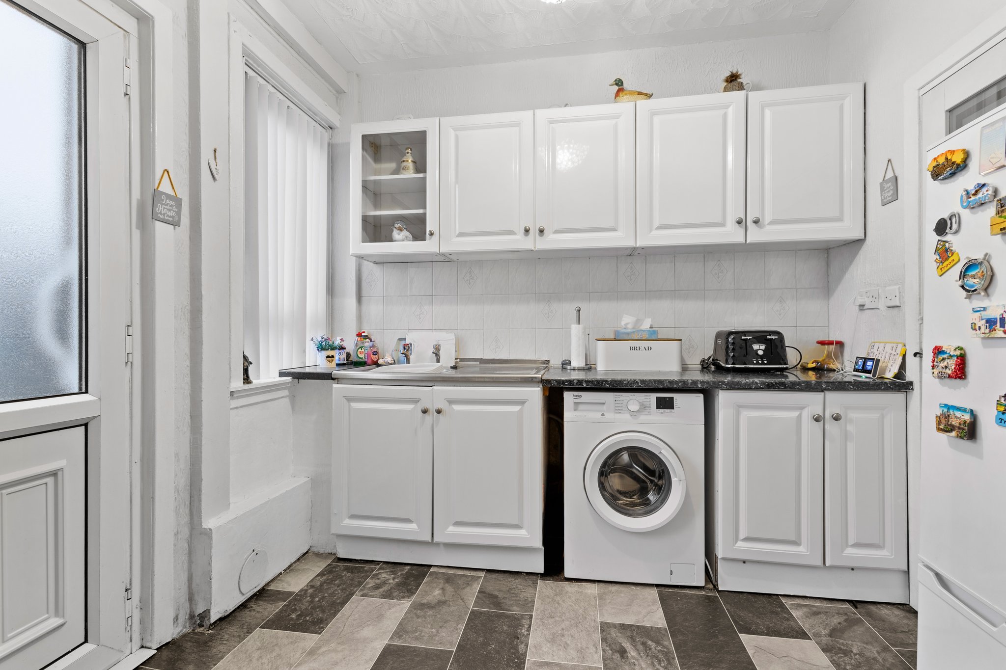 3.78m x 2.81m (12′ 5″ x 9′ 3″) Fully fitted kitchen complete with ample wall and base storage units, complimentary work surface, plumbing and space for a cooker and washing machine, stainless steel sink and drainer, neutral decor, vinyl flooring, a double glazed window to the rear and a door leading to the rear garden.