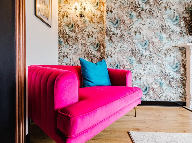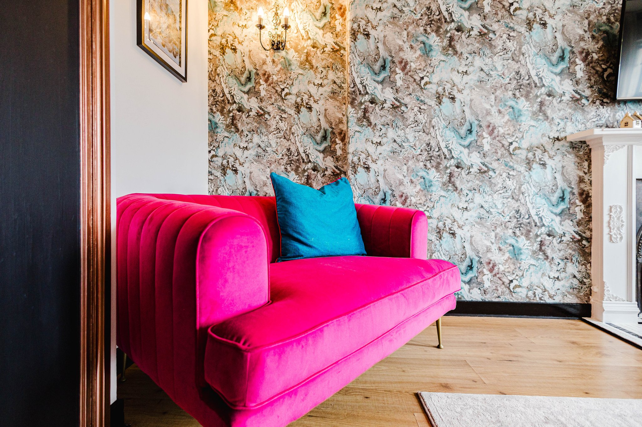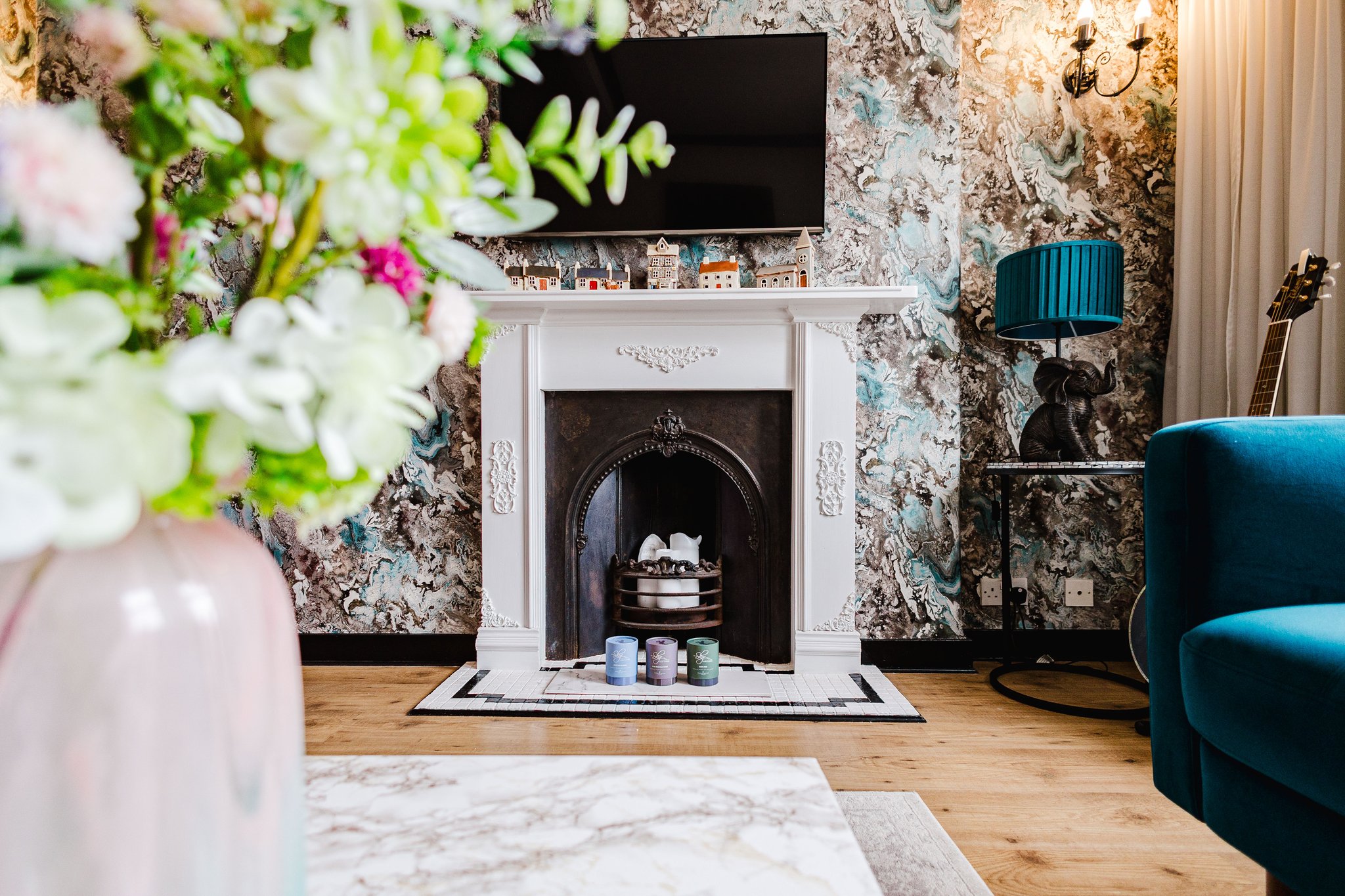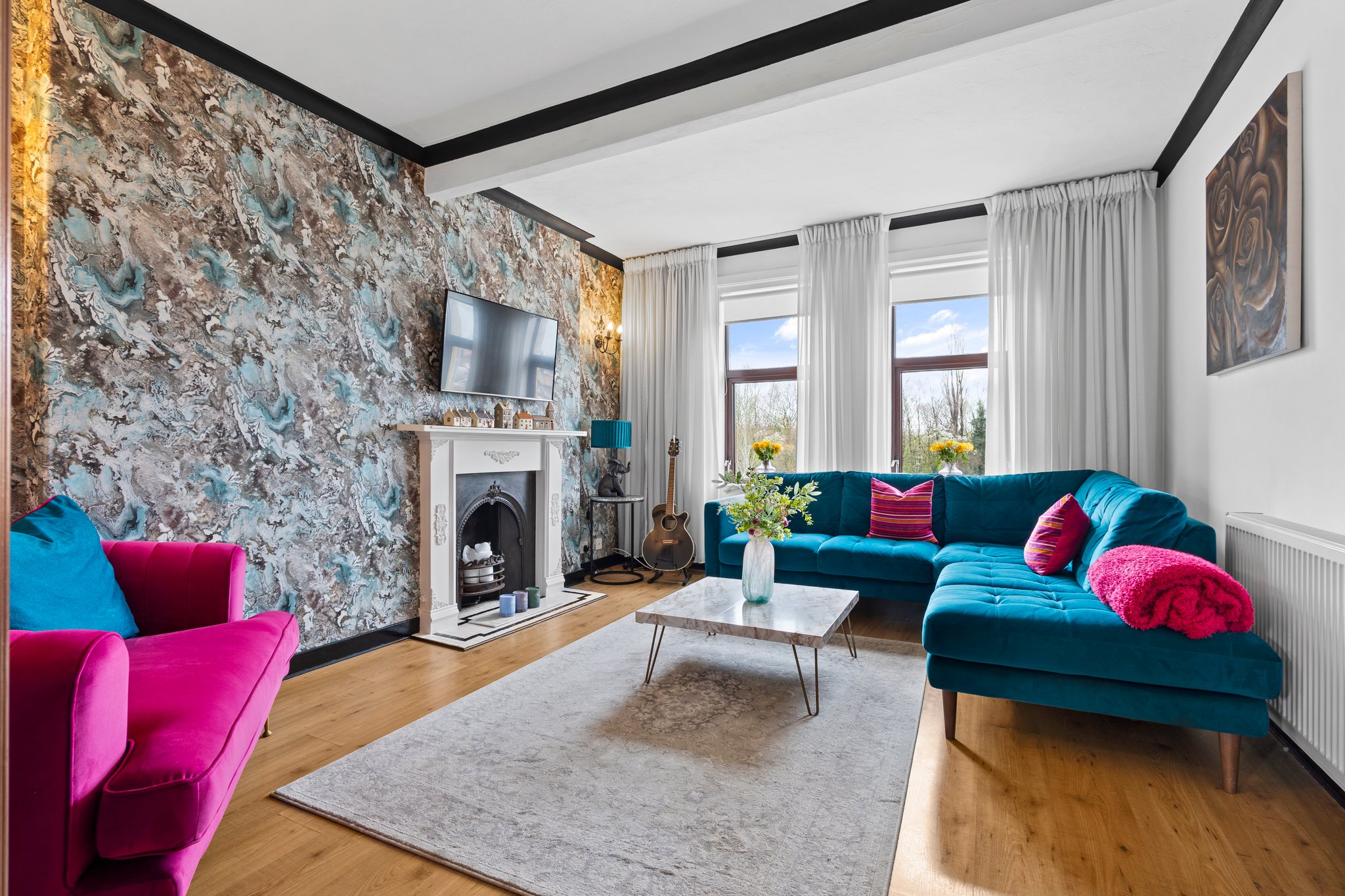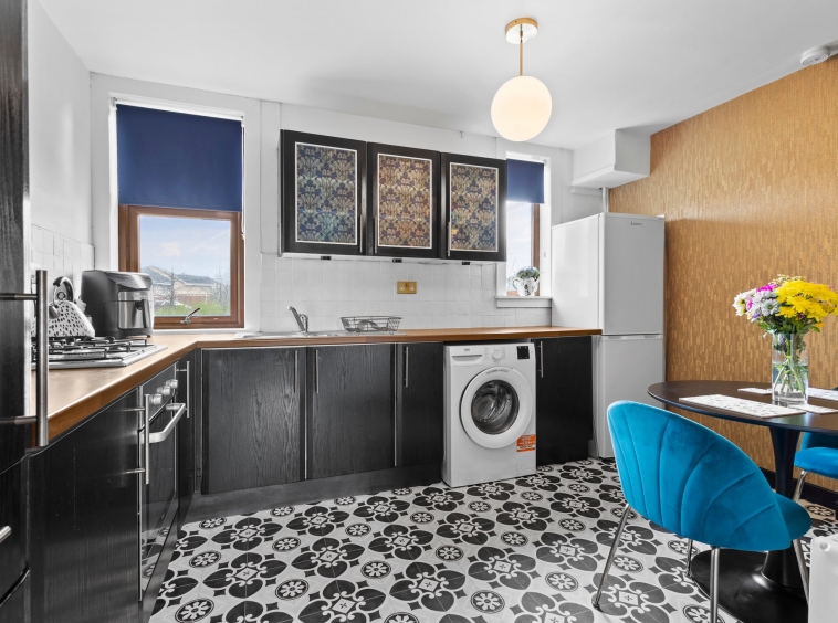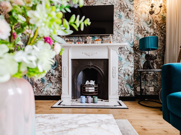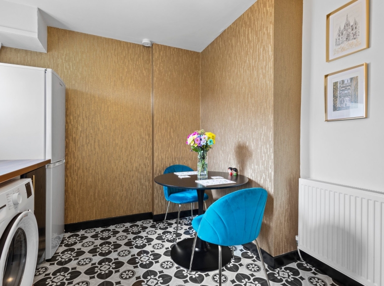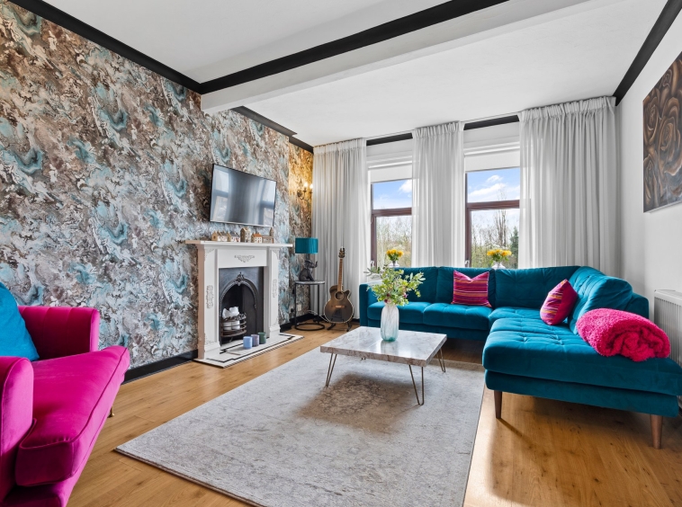 3.77m x 5.09m (12′ 4″ x 16′ 8″) Generously proportioned main apartment boasting a stylish contemporary decor, a stunning feature wrought iron fire with an intricate wooden surround and tiled hearth, plentiful space for free standing furniture, laminate flooring, two large double glazed windows to the front and a sliding door giving access to the kitchen.