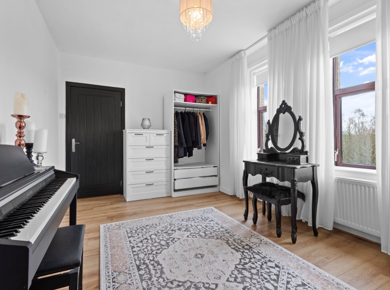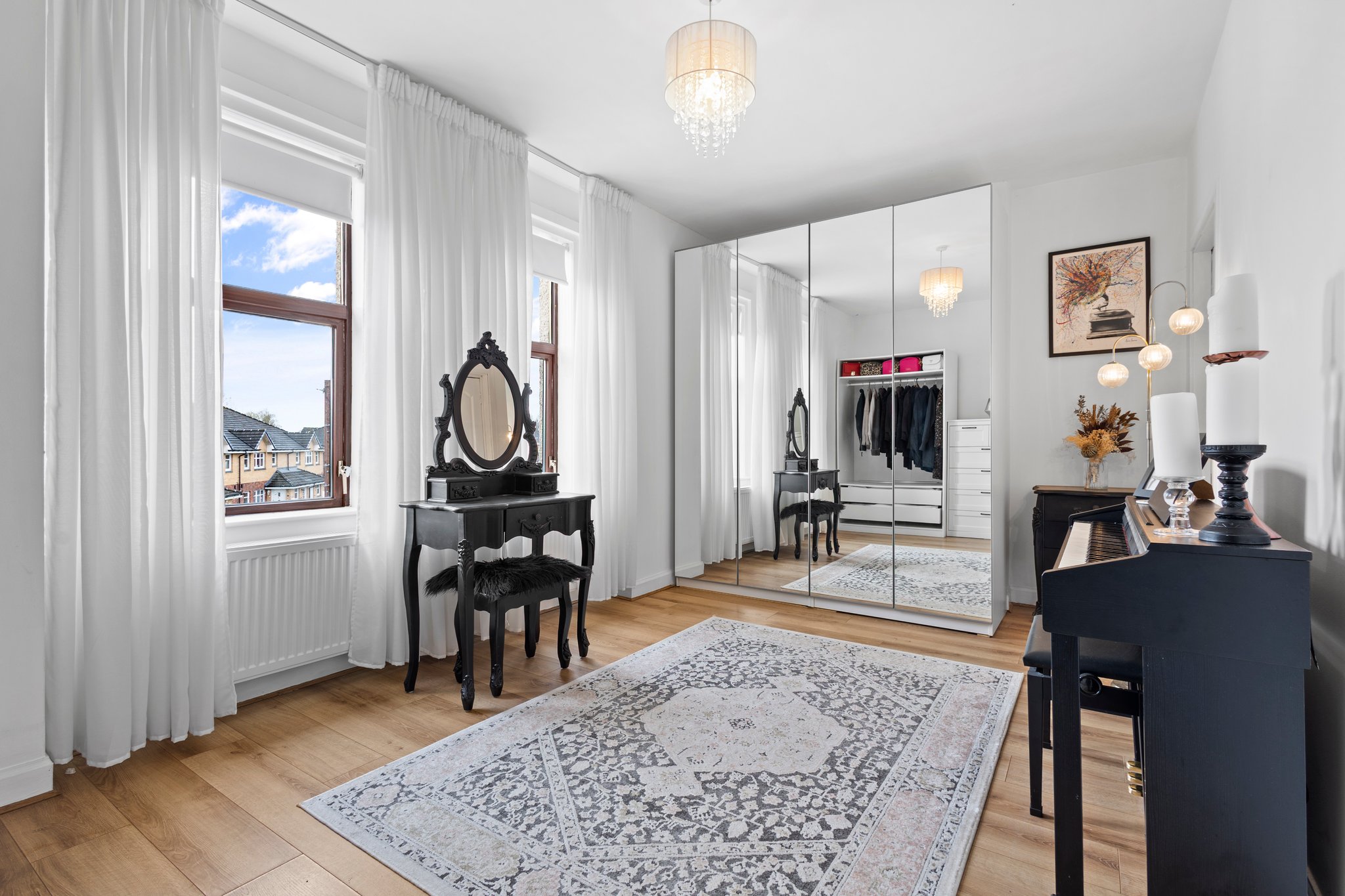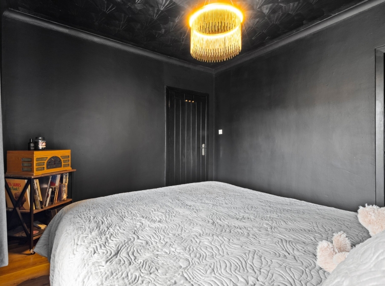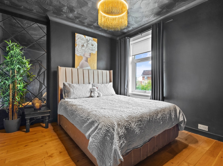 4.97m x 3.06m (16′ 4″ x 10′ 0″) The master bedroom is generous double boasting modern striking monochrome black finish, practical storage cupboard, laminate flooring and a double glazed window to the rear.
