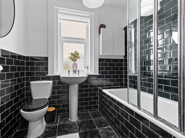2.33m x 2.01m (7′ 8″ x 6′ 7″) Completing the accommodation is the the stylish bathroom comprising of a wash hand basin, wc, bath with overhead electric shower, neutral decor with a stylish black brick effect tiled finish to half height, tiled flooring and a double glazed window to the rear.