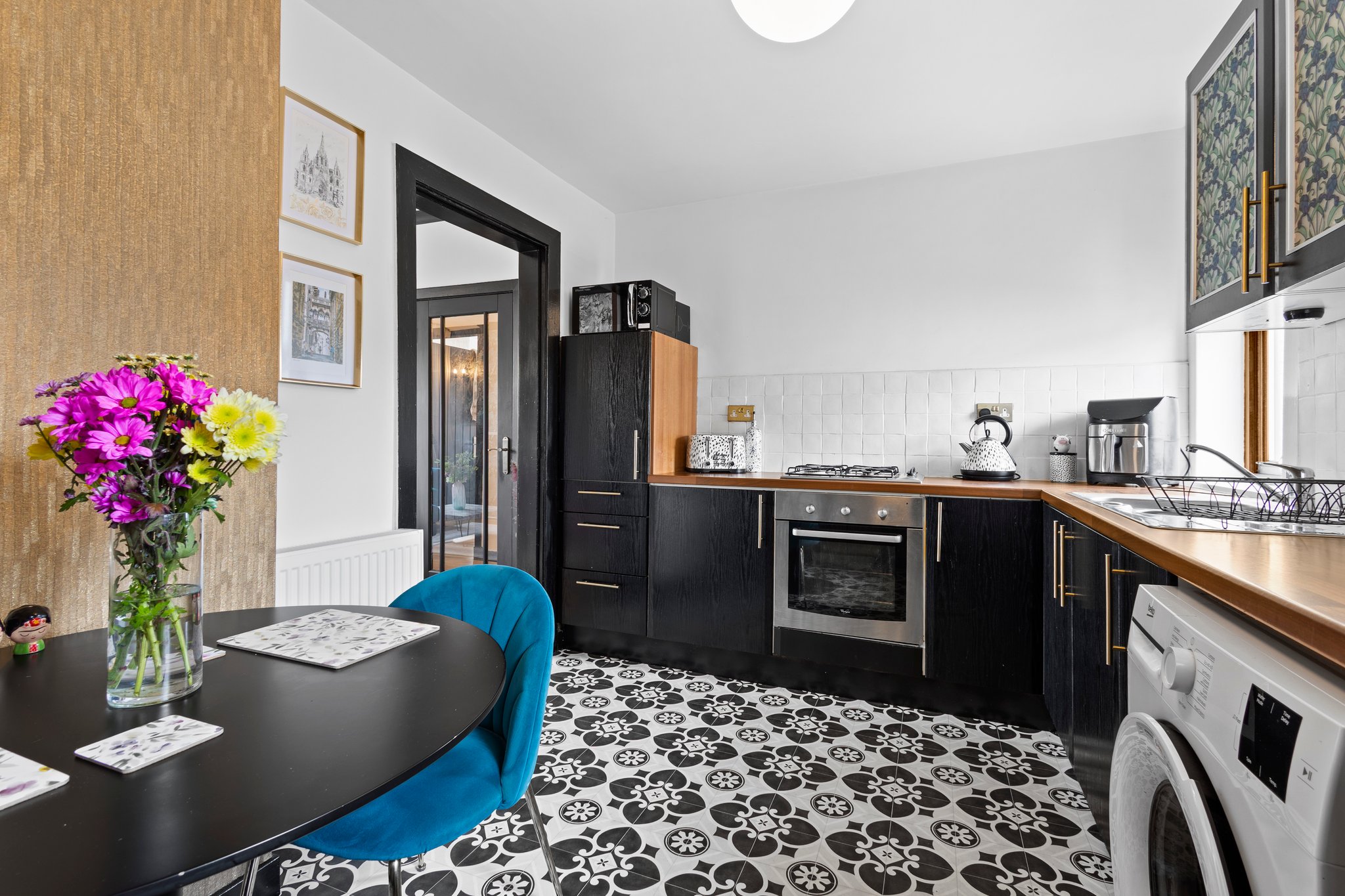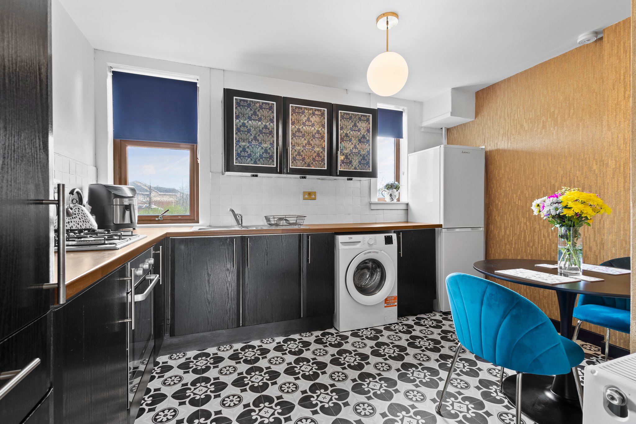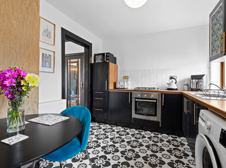 3.76m x 2.72m (12′ 4″ x 8′ 11″) Fully fitting kitchen complete with stylish wall and base units providing ample storage with complimentary work surface, integrated oven and gas hob, plumbing and space for a washing machine and fridge freezer, stainless steel sink and drainer, stylish decor, space for a dining table and chairs, vinyl flooring and two double glazed window to the rear.