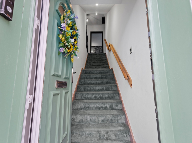 1.03m x 1.10m (3′ 5″ x 3′ 7″) Access is given to a welcoming entrance hallway offering crisp neutral decor and a carpeted staircase leading to the hallway.