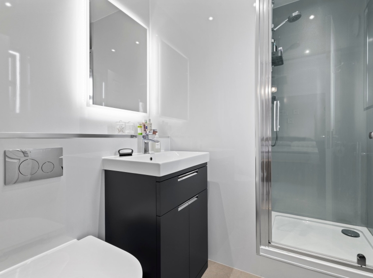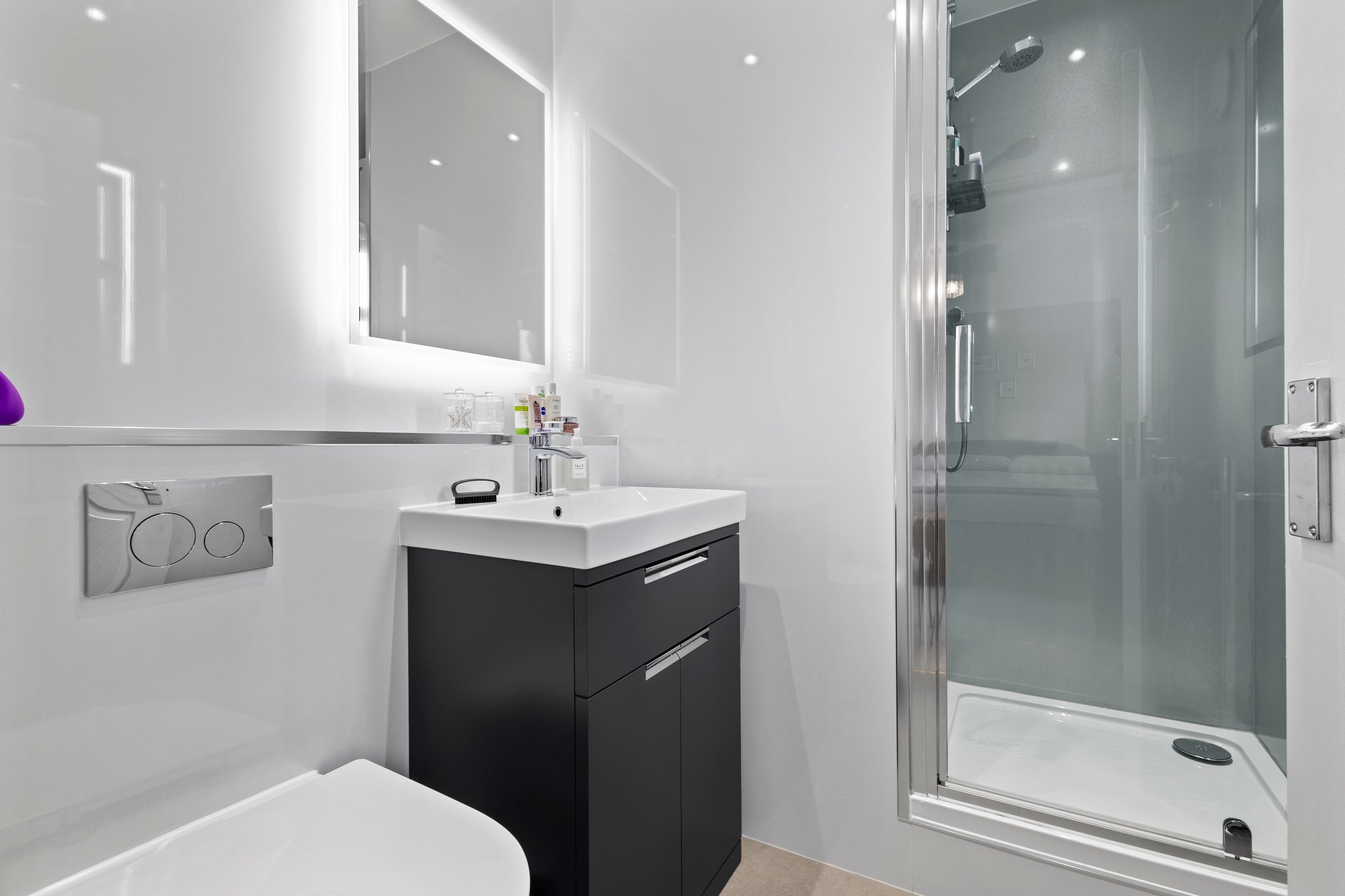 2.74m x 1.72m (9′ 0″ x 5′ 8″) Stylish en-suite comprising of a wash hand basin with vanity storage, wc, shower cubicle with mains shower, led mirror, heated towel rail, modern decor, wet wall finish around shower, vinyl flooring and a double glazed window to the front.