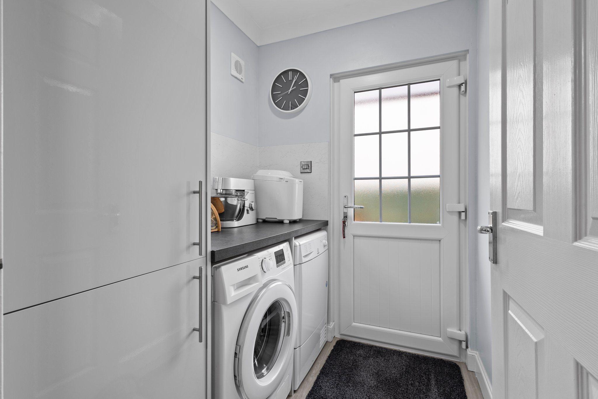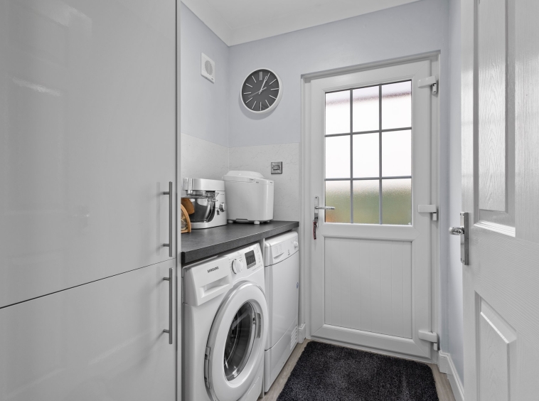 1.91m x 1.67m (6′ 3″ x 5′ 6″) Practical utility offering additional storage units, plumbing and space for a washing machine and tumble drier, neutral decor, laminate flooring and a door leading to the rear garden.