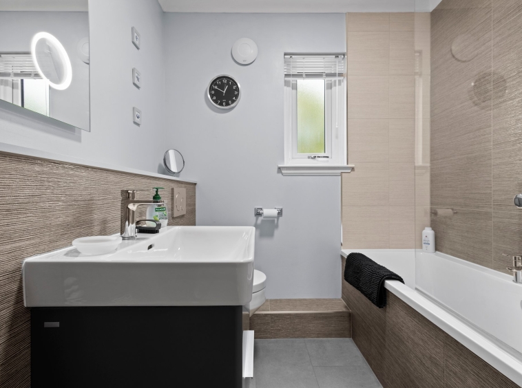 2.05m x 2.51m (6′ 9″ x 8′ 3″) Completing the accommodation is the family bathroom comprising of a wash hand basin with vanity storage, led mirror, heated towel rail, bath with overhead mains shower, stylish decor, wet wall finish around bath, vinyl flooring and a double glazed window to the rear.