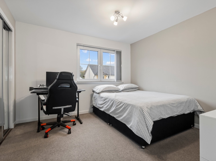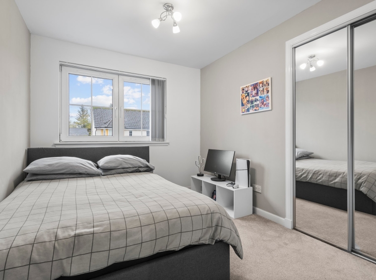 2.5m x 3.09m (8′ 2″ x 10′ 2″) Double bedroom featuring neutral decor, fitted carpet, fitted wardrobes and double glazed window to the front.