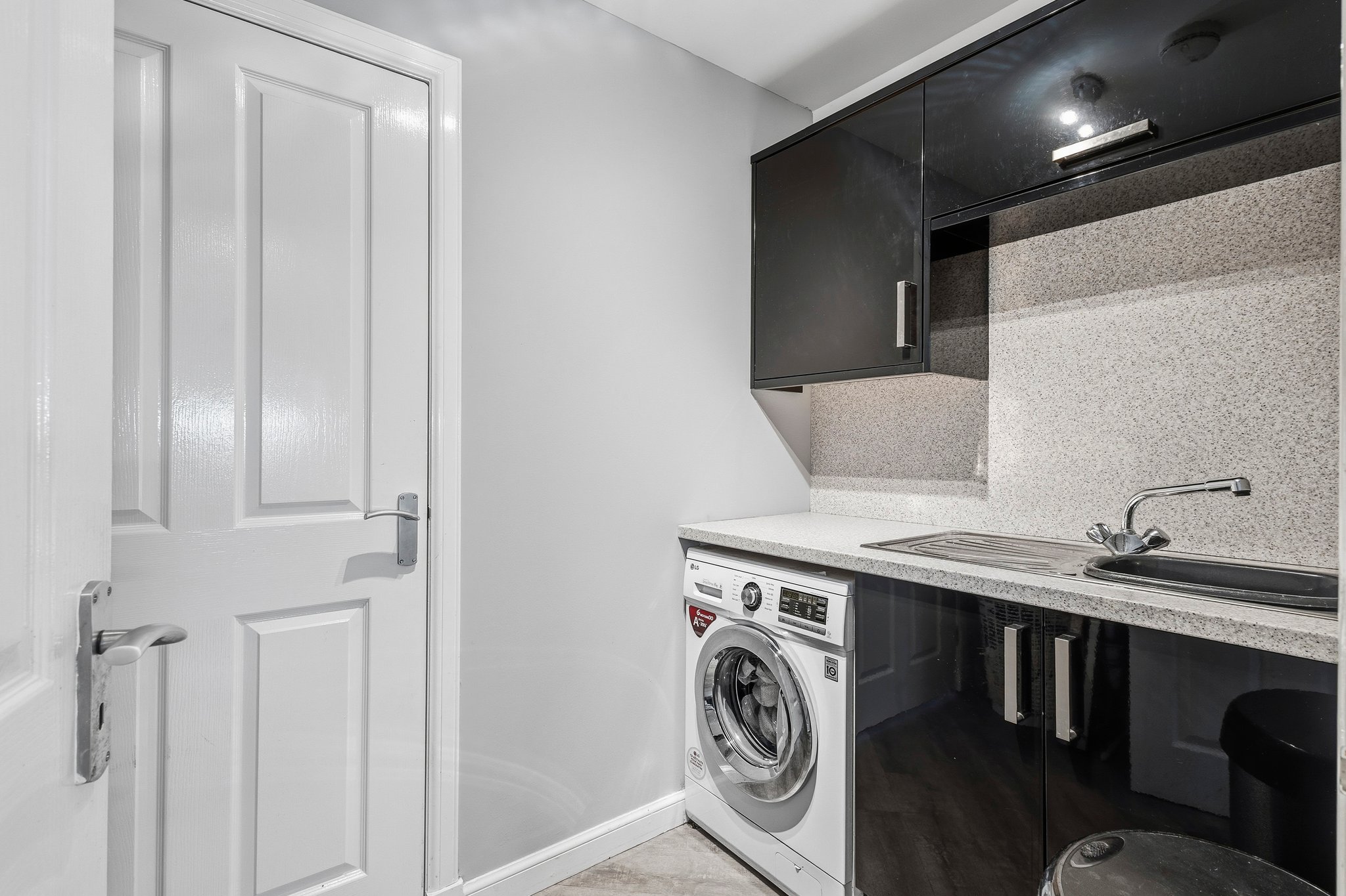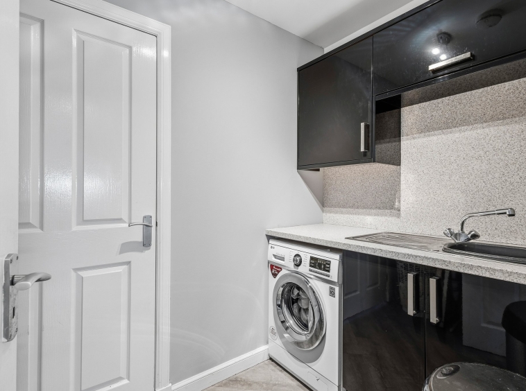 2.53m x 1.50m (8′ 4″ x 4′ 11″) Utility room featuring black gloss wall and base units, contrasting work surface, plumbing space for a washing machine, neutral decor, vinyl flooring and door access to family room.