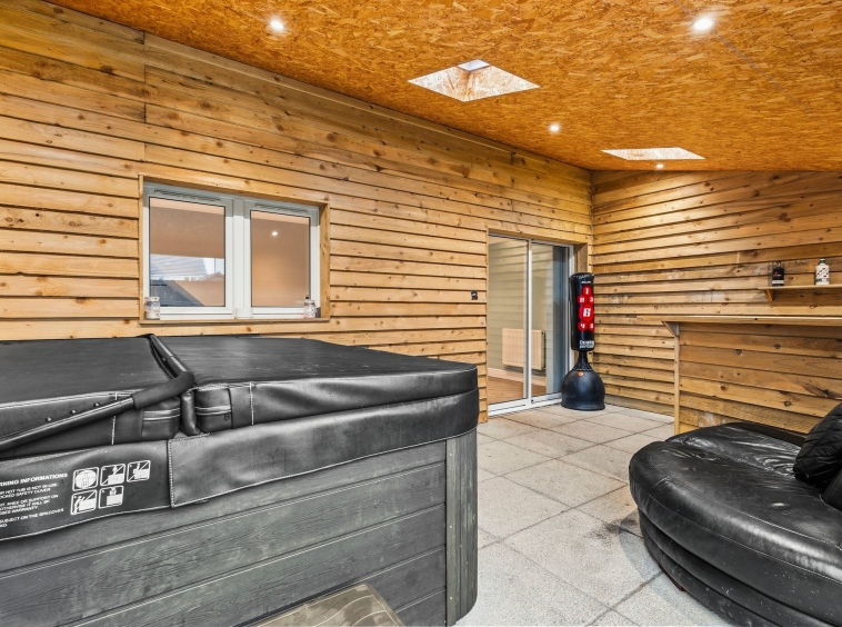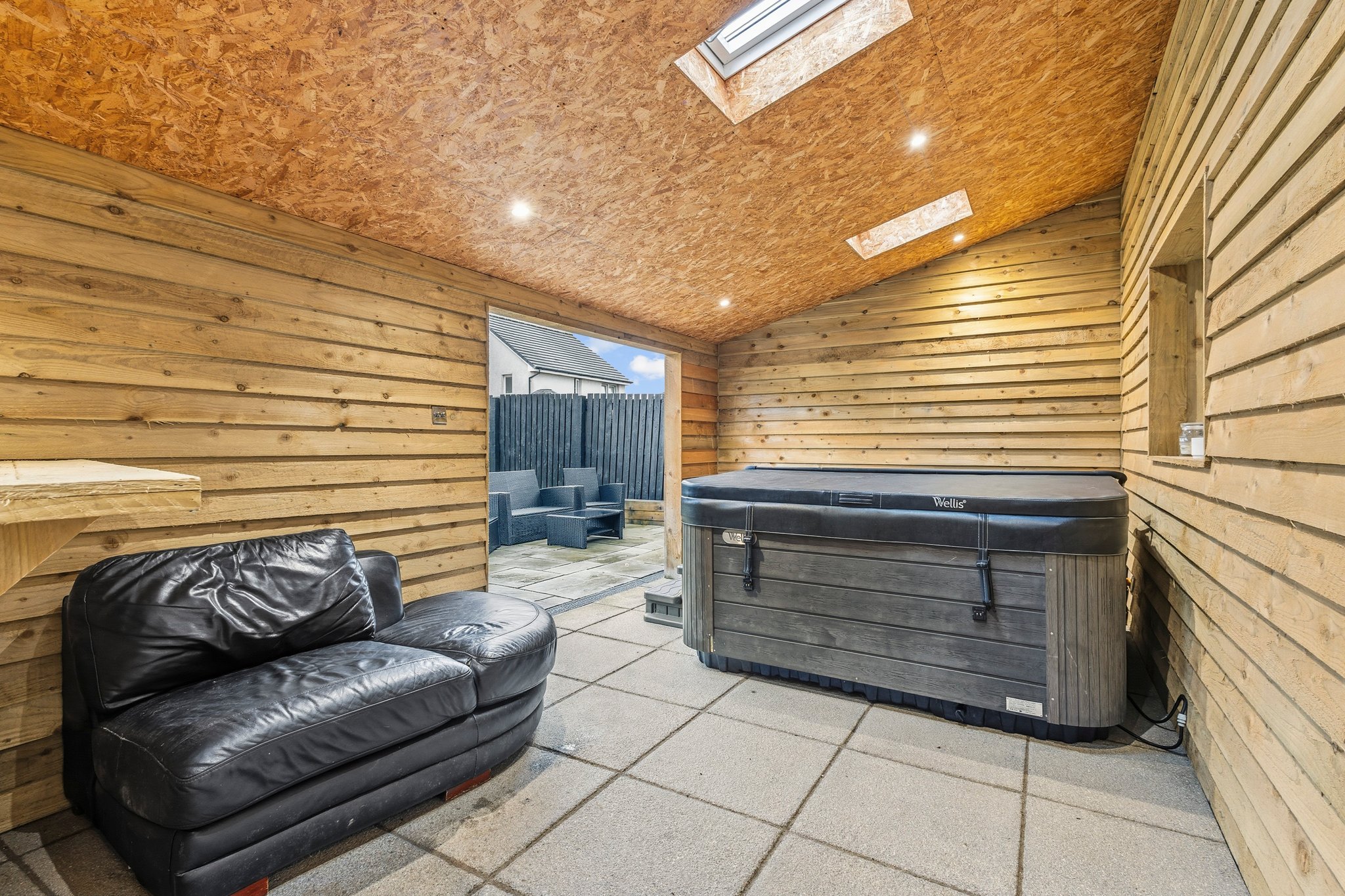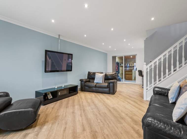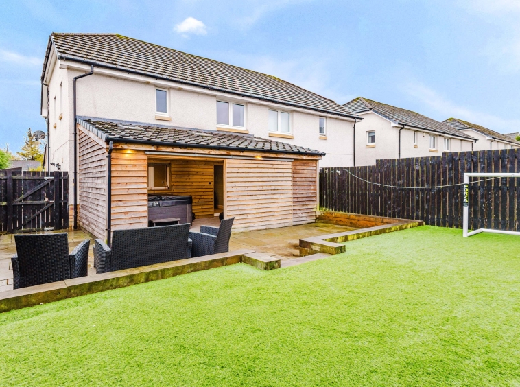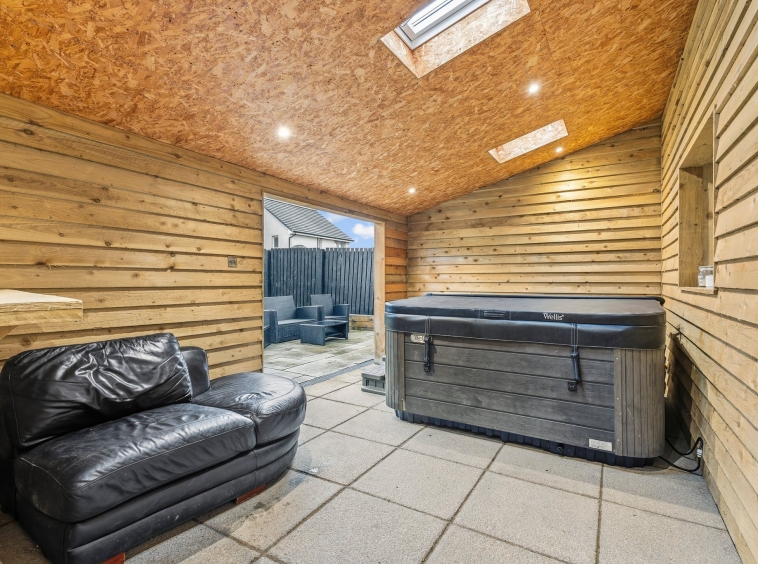 This property further benefits from a double driveway to the front laid to mono block. The rear garden boasts an impressive timber covered patio area, 3.28m x 6.30m (10′ 9″ x 20′ 8″), currently housing a hot tub and a bar, perfect for entertaining or relaxing. The rear garden has been landscaped with ease of maintenance in mind with an artificial lawn and patio area laid to slab.