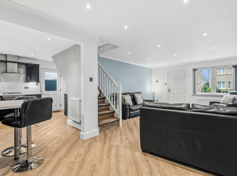 4.23m x 7.68m (13′ 11″ x 25′ 2″) A generous, open plan main apartment offering ample living space, space for a dining area flowing through to the kitchen. Featuring contemporary decor, ceiling coving, ceiling spotlights, oak effect LVT flooring, stair case with fitted carpet leading to upper level, double glazed window to the front and double glazed patio doors leading to the rear garden.