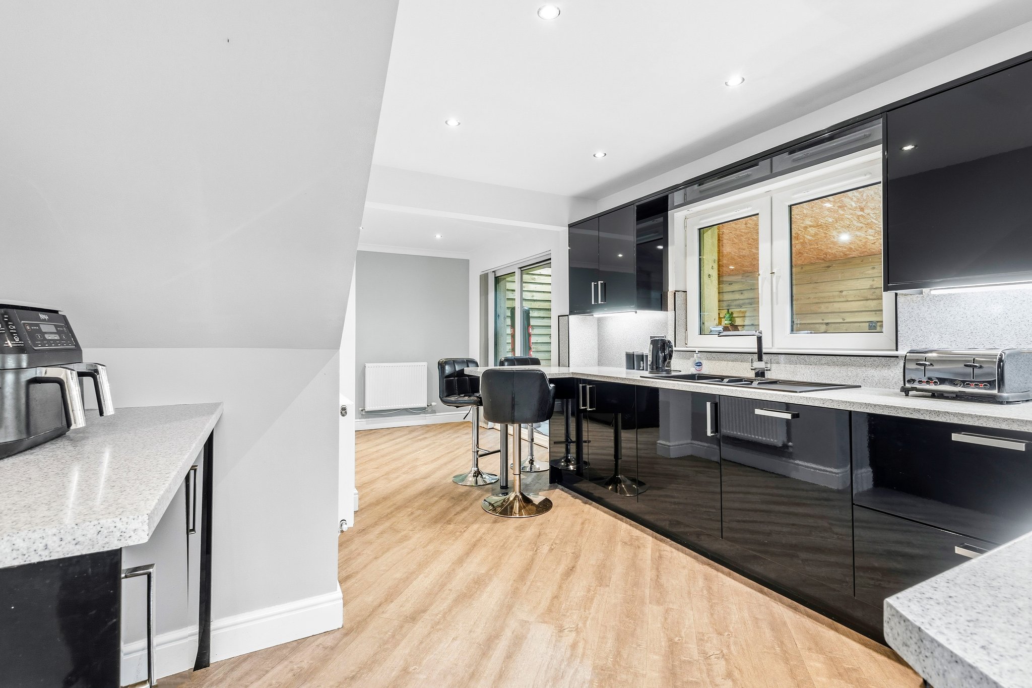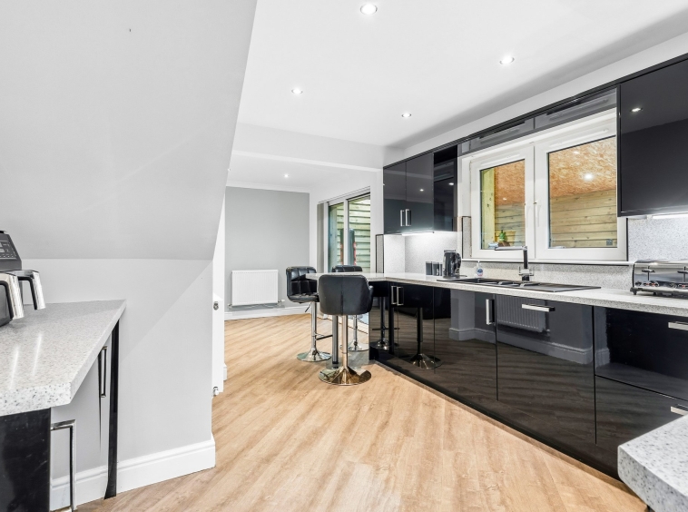 3.94m x 3.45m (12′ 11″ x 11′ 4″) Fitted kitchen offering an array of black gloss wall and base units, contrasting worksurface and back splash, composite anthracite sink and drainer, integrated gas hob and extractor hood, integrated oven and dishwasher, breakfast bar, neural decor, ceiling spotlights, oak effect LVT flooring, door access to the utility room, double glazed window to the rear and opaque double glazed wooden door to the side.